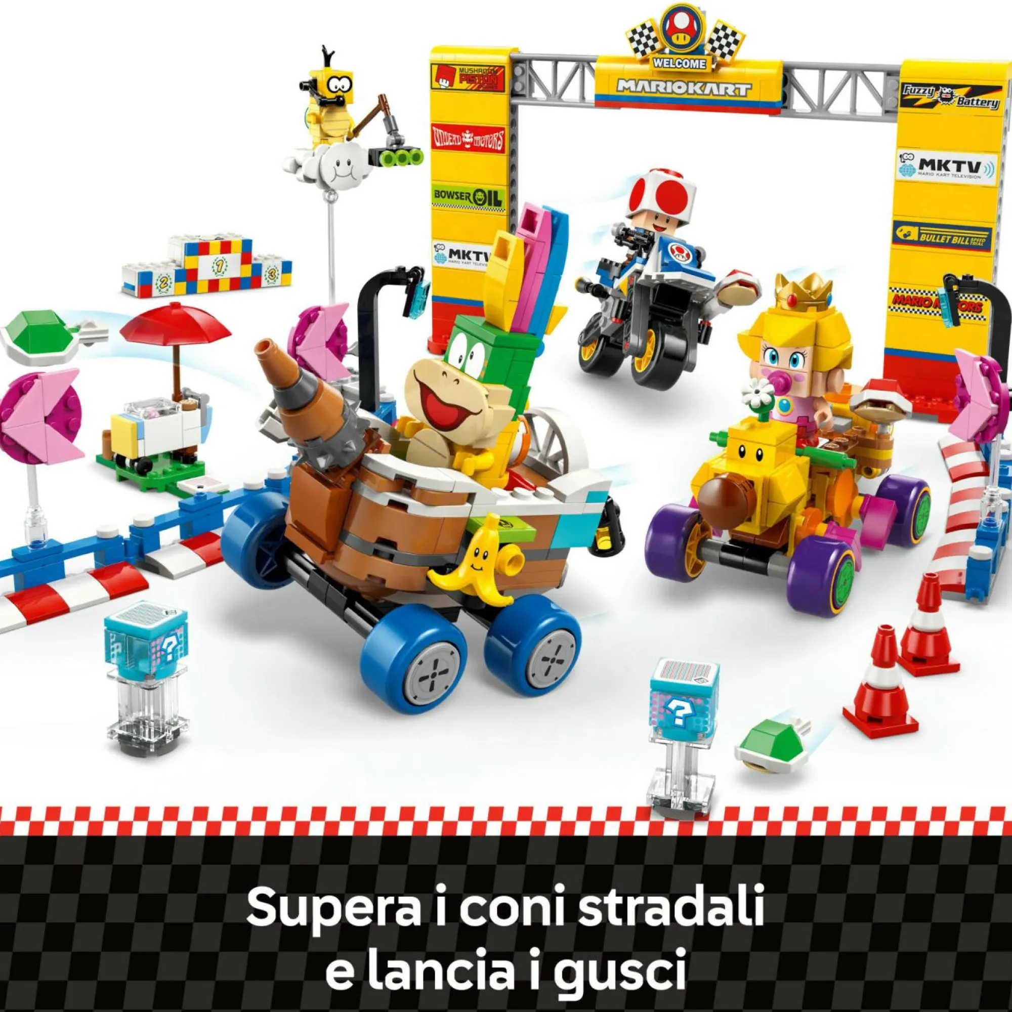 4 personaggi Mario Kart collezionabili: questo set di giochi d’avventura con i mattoncini LEGO include i personaggi di Baby Principessa Peach, Lakitu, Lemmy e un Toad giocattolo, oltre a accessori assortiti per il gioco di ruolo