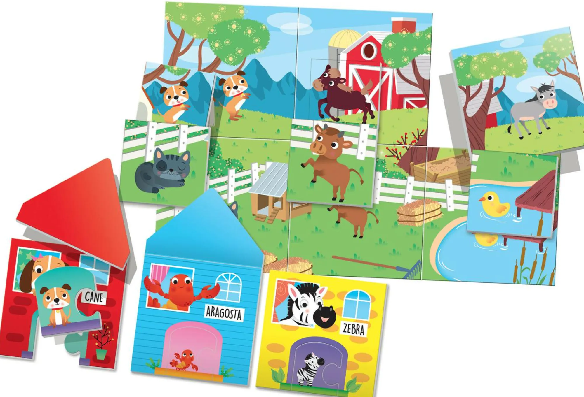 Con questo gioco i bambini potranno divertirsi in compagnia dei loro amici a scoprire gli animali della fattoria, del bosco, della savana e del mare! Giocheranno a tombola, a ricomporre le casette degli animali e, dopo aver ricostruito i diversi habitat, ad associare le mamme ai propri cuccioli. Le attività proposte stimolano la logica e l’attenzione, ma anche la creatività e la fantasia dei bambini.