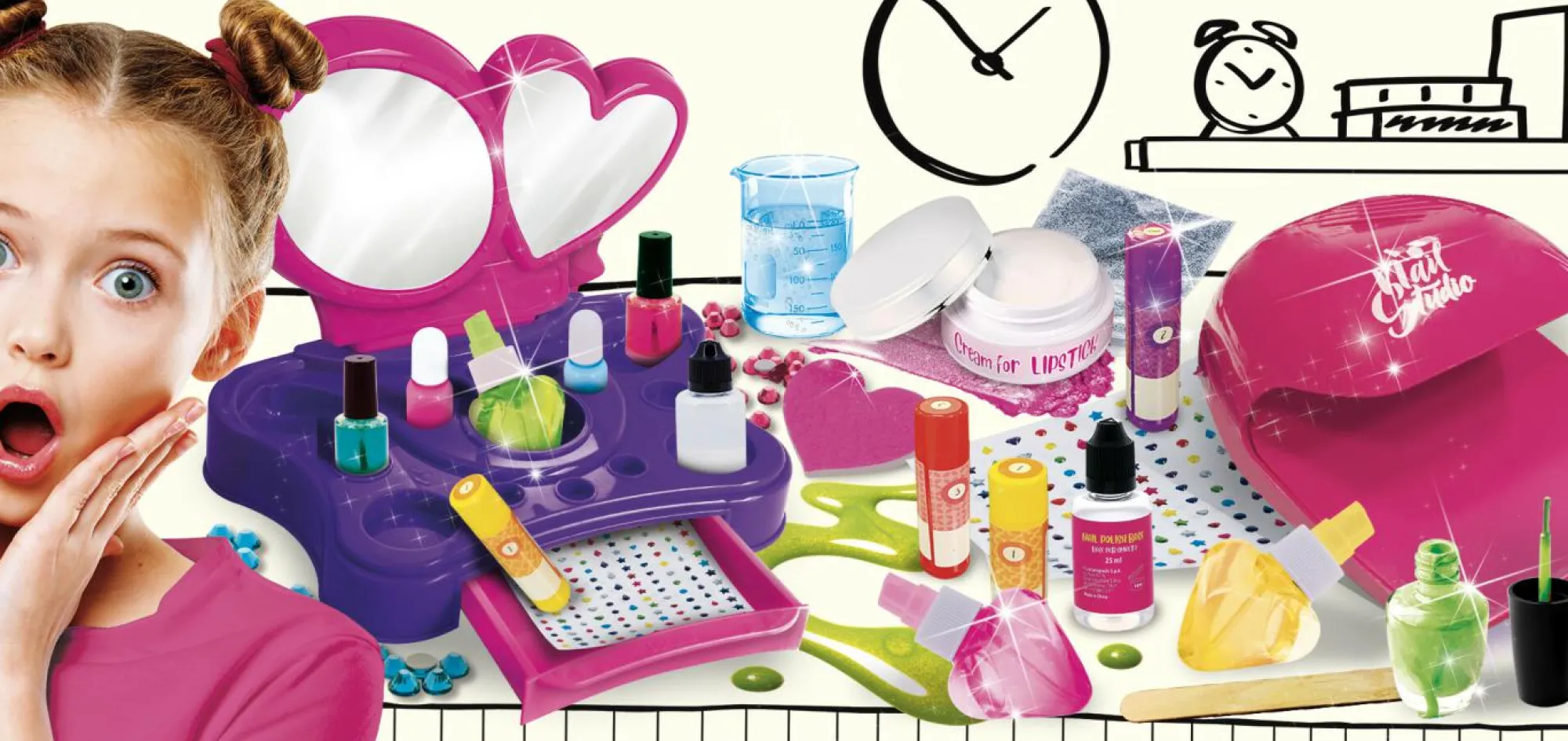 Base smalto, Glitter, Boccette per smalto, Asciuga-smalto elettrico, Strass adesivi, Limetta, Coloranti, Pipetta, Base per rossetti, Applicatori per rossetti, Aromi, Solvente neutro, Provetta con tappo, Boccette spray per profumi, Ciotolina, Spatolina, Bicchiere graduato, limetta, toeletta in plastica, Manuale illustrato