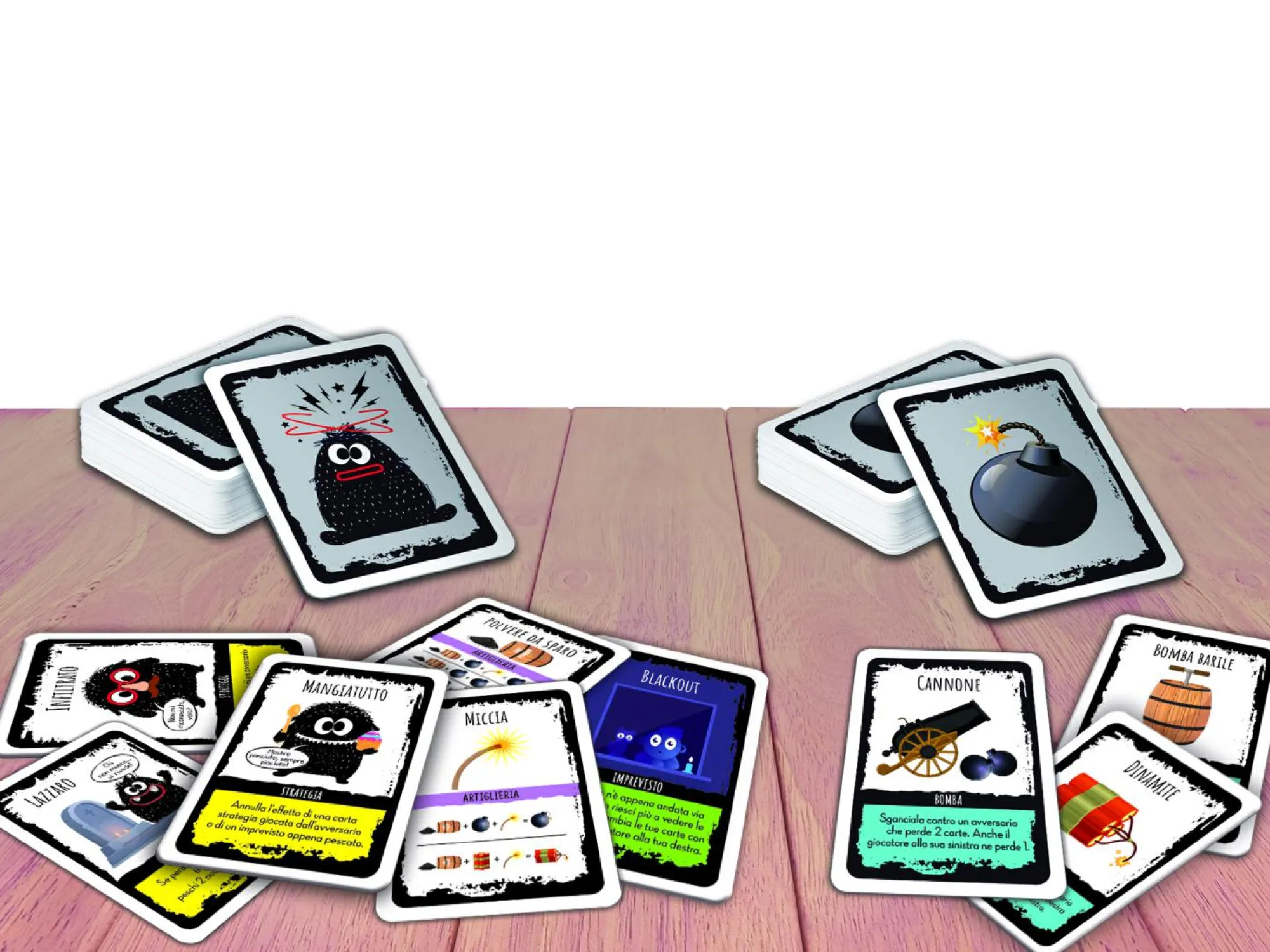 Un gioco di carte che ti terrà col fiato sospeso! – Riuscirai ad evitare le esplosioni? – In un fantastico cofanetto di metallo! – Con il mostriciattolo portafortuna