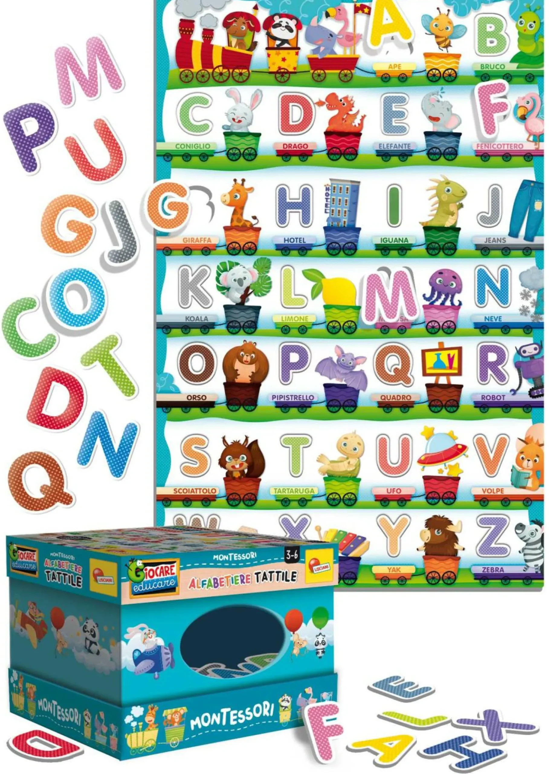 Con la speciale scatola tattile! – Ricomponi l’allegro alfabetiere! – Cerca le letterine usando solo il tatto! – Made in Italy