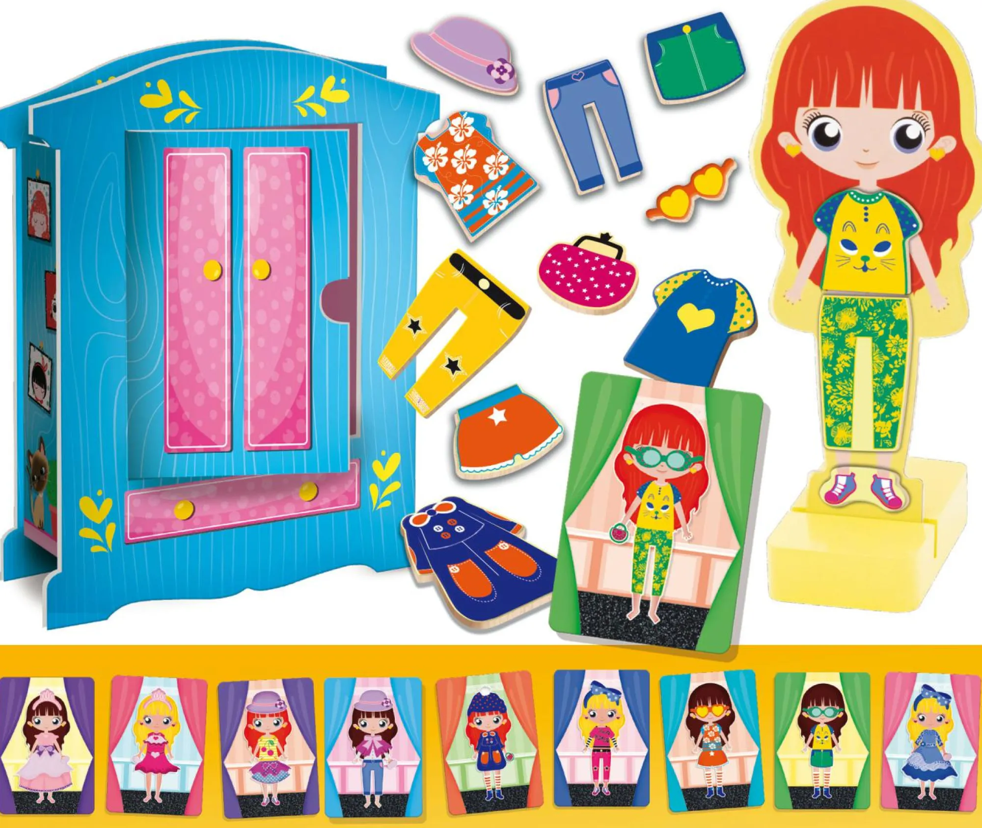 Armadio 3D – 26 abiti magnetici – Bambolina in legno con supporto – 10 cards outfit – Segnapunti con gettoni – Istruzioni