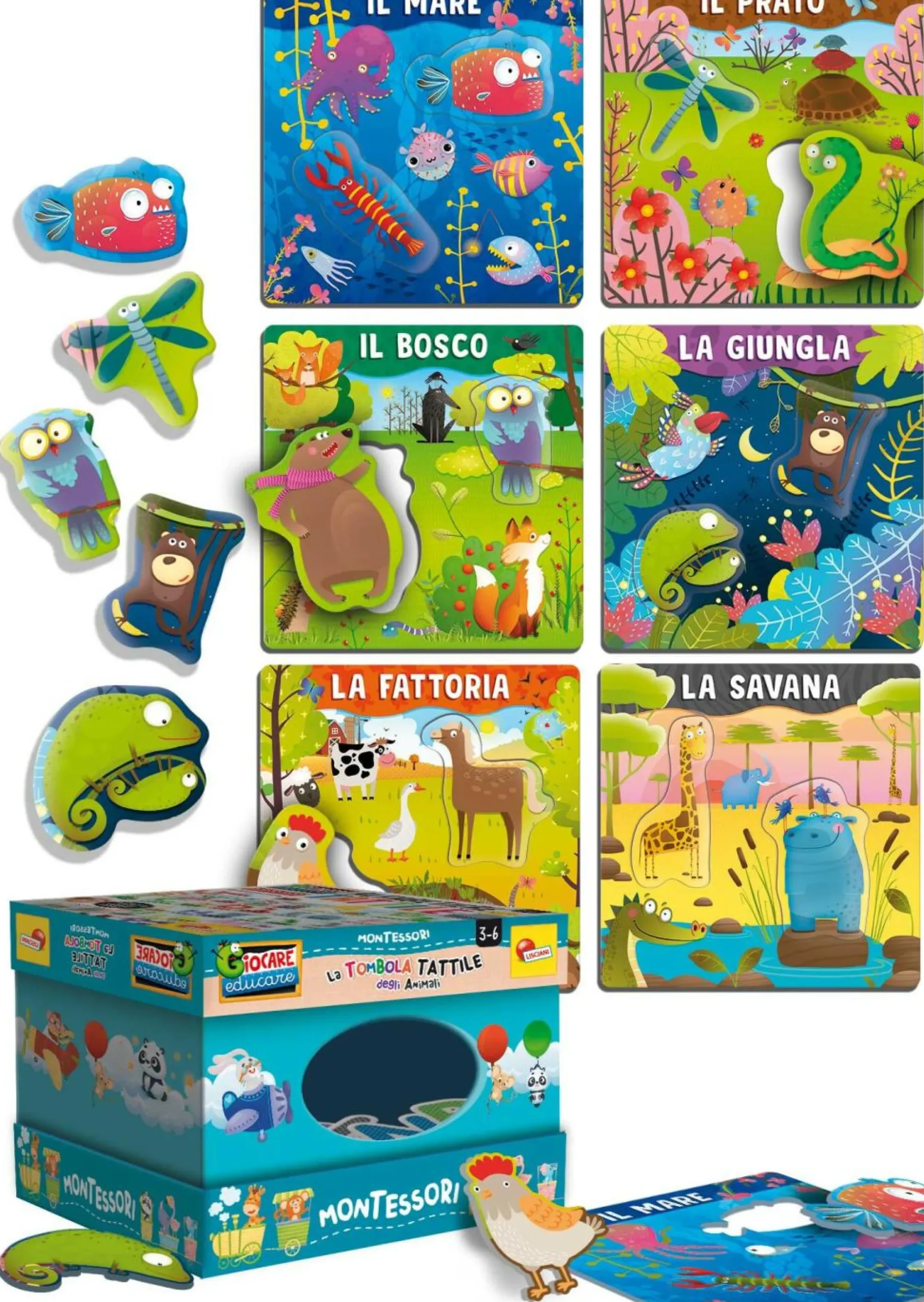 Con la speciale scatola tattile! – Con 6 cartelle degli ambienti! – Cerca gli animali usando il tatto! – Made in Italy