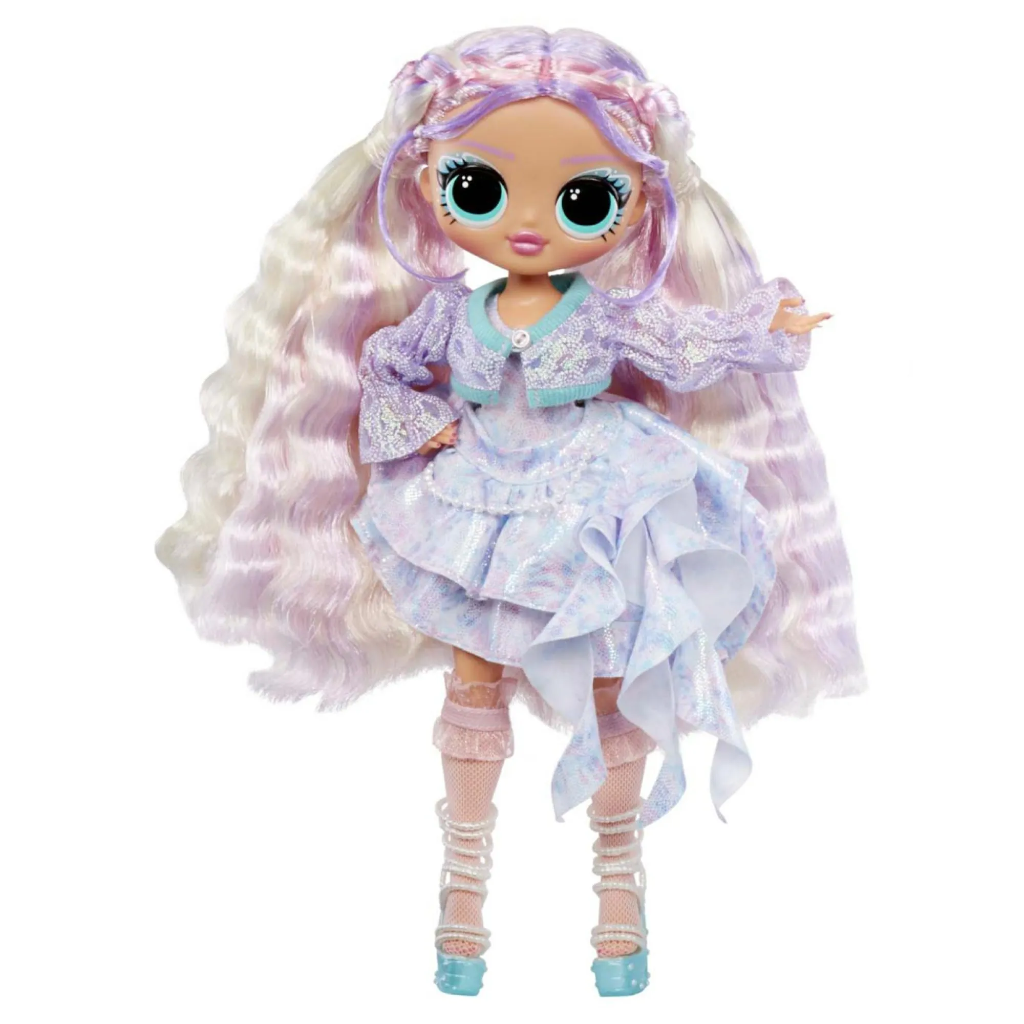 Set con bambola: giacca e vestito pastello, borsa conchiglia, occhiali cuore, calze alte, scarpe perlate, collana, bracciale, orecchini e spazzola