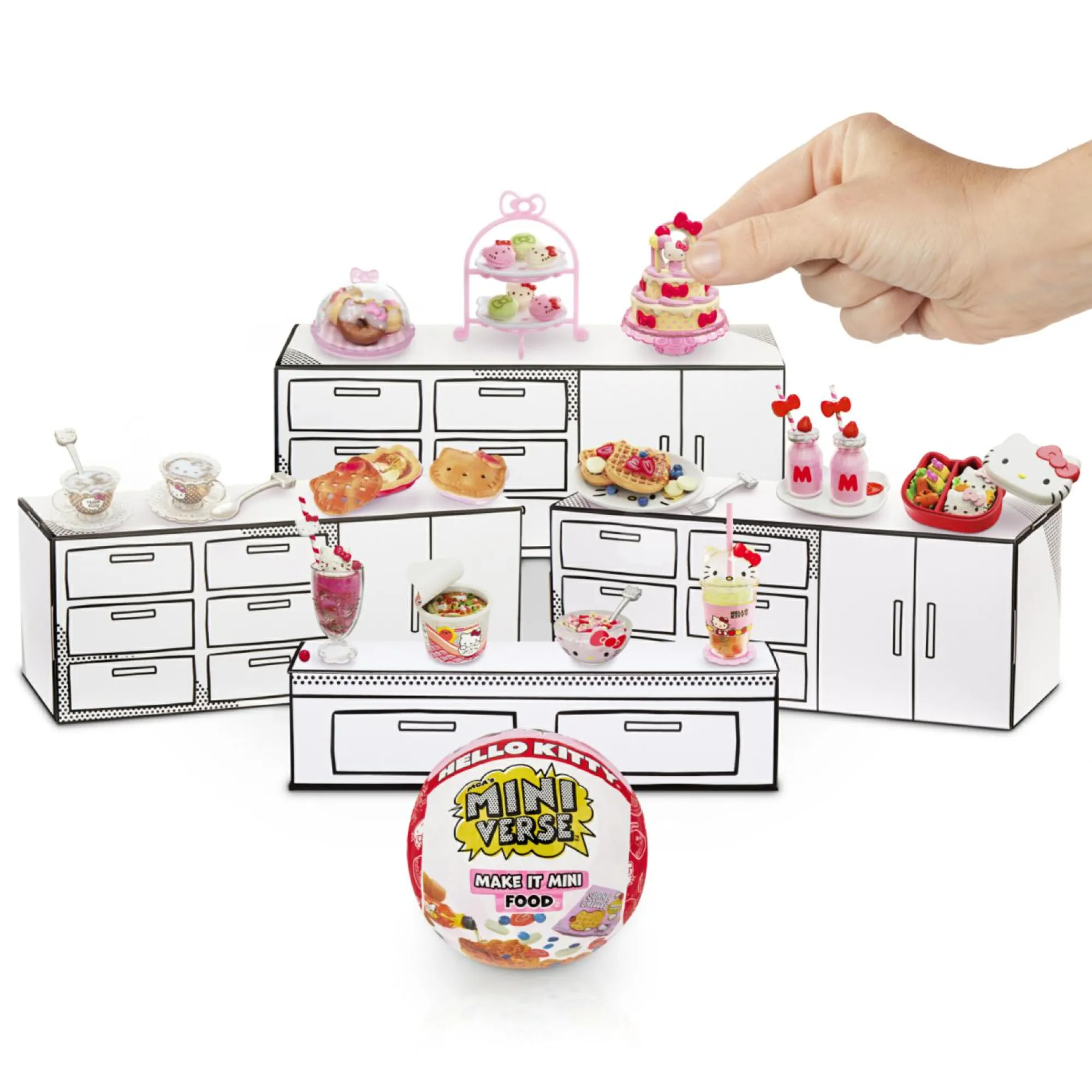 Ogni pallina si trasforma in una vetrina Hello Kitty con mini tavolini a tema Hello Kitty, perfetti per mettere in mostra la tua creazione!