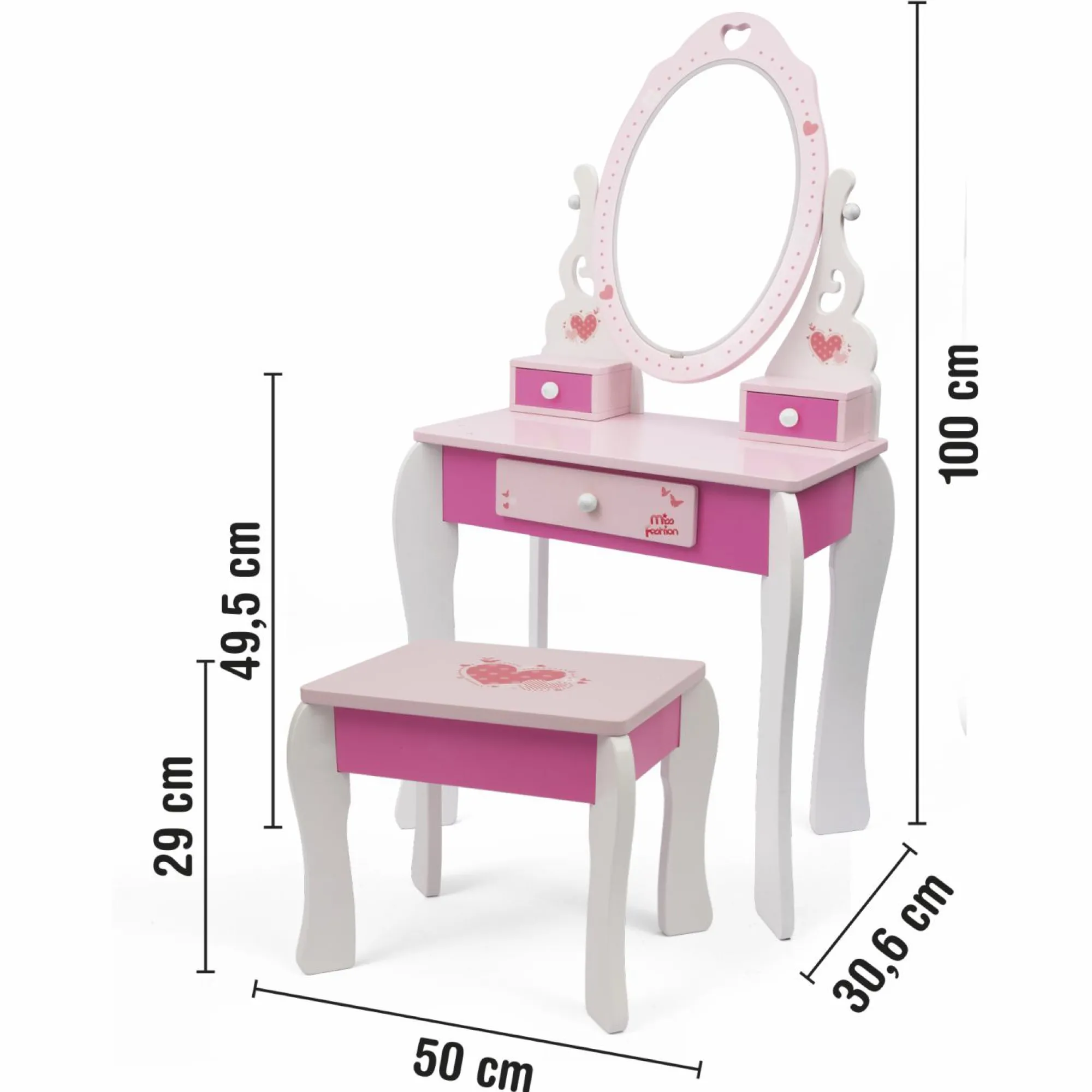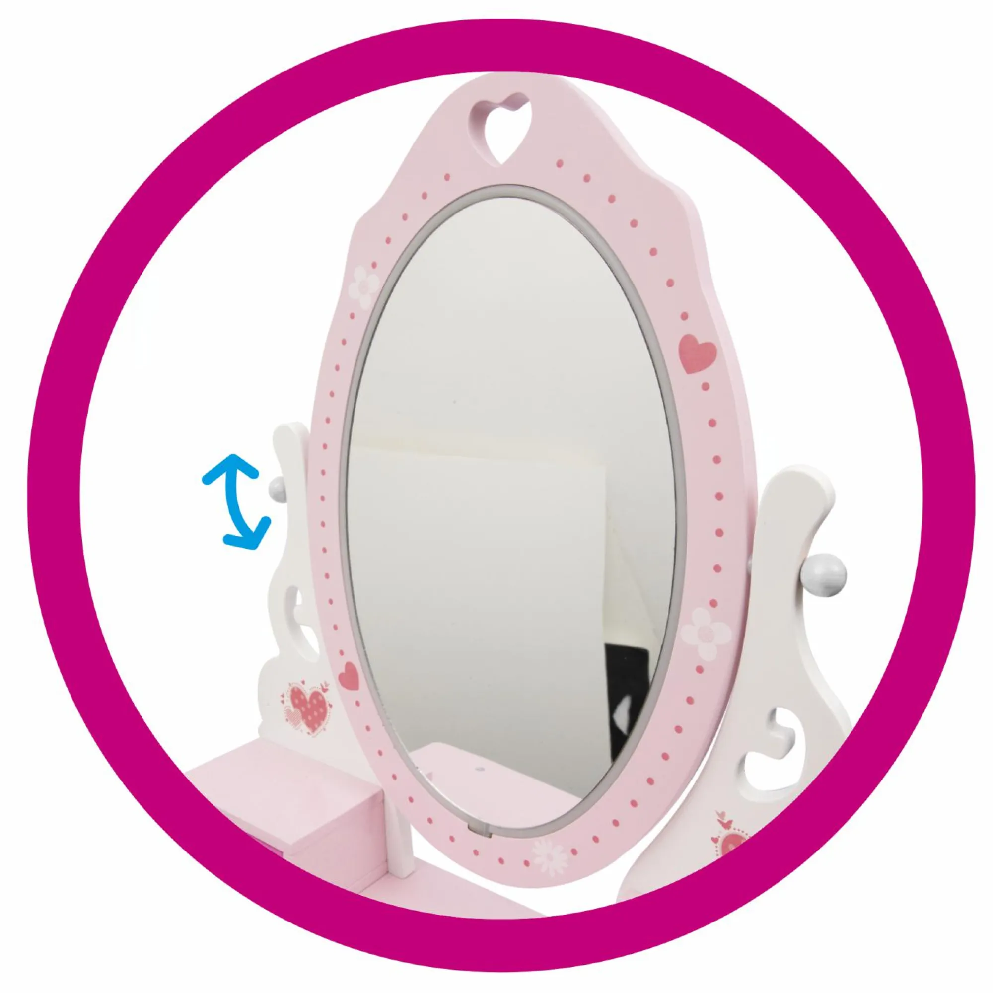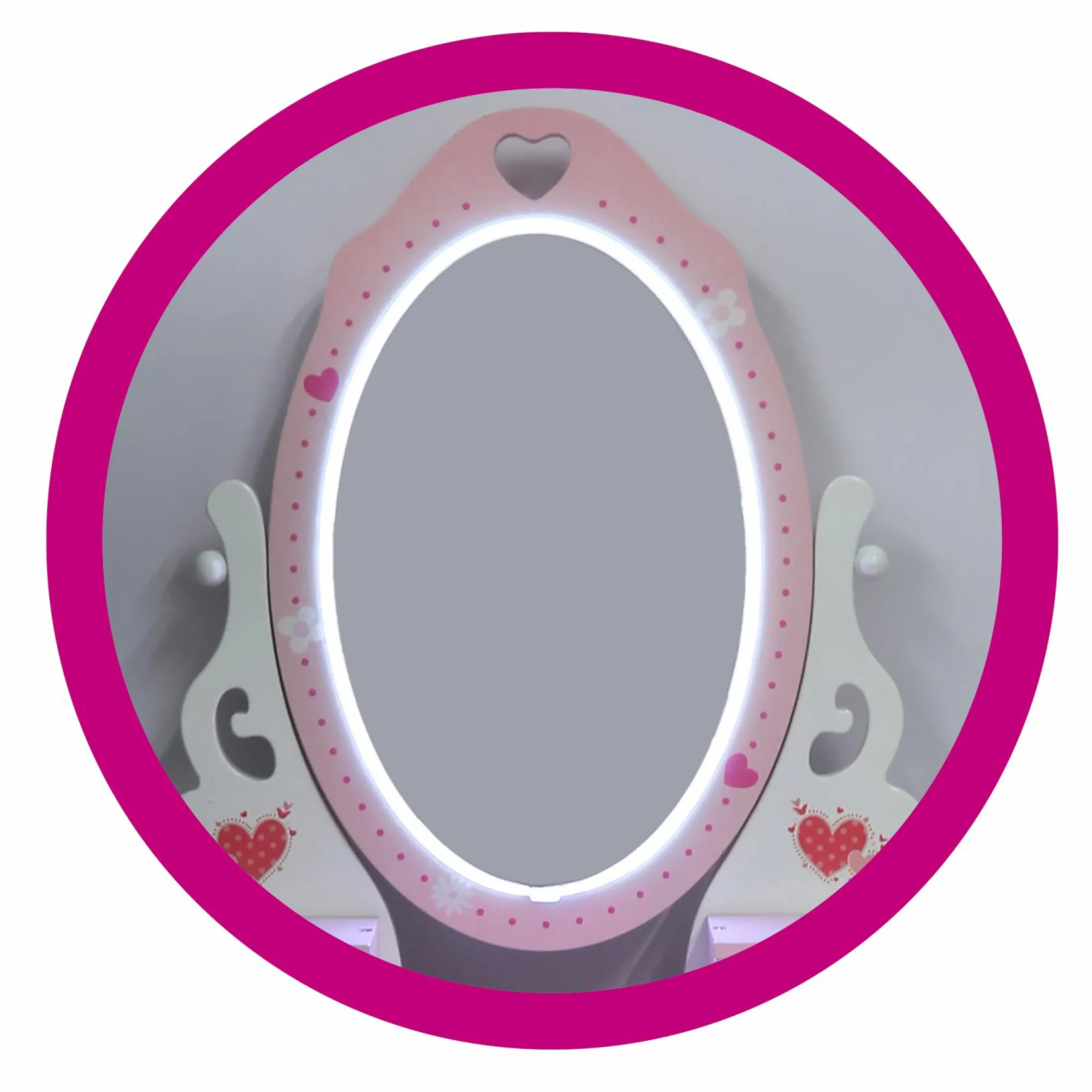 Le luci led intorno allo specchio funzionano a pile. Questo permette di posizionare la Vanity Table in qualunque area della cameretta, senza il vincolo della presa elettrica.