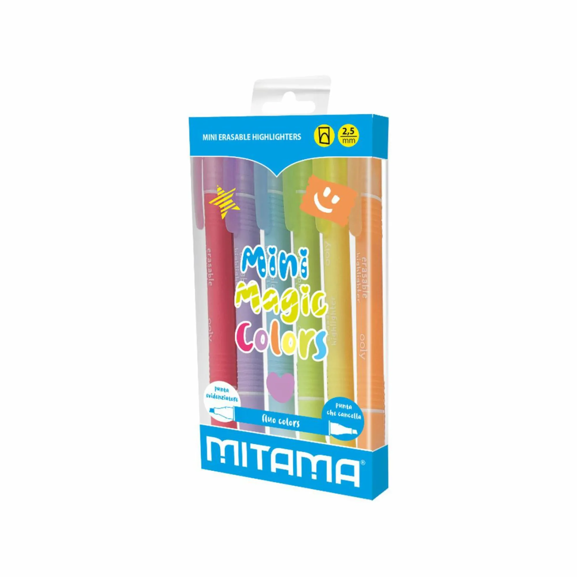 Evidenziatori mini cancellabili Mitama con doppia punta: una punta è un evidenziatore, l’altra punta bianca cancella! In pack ecologico Usa&Riusa 100% riciclato e riciclabile!