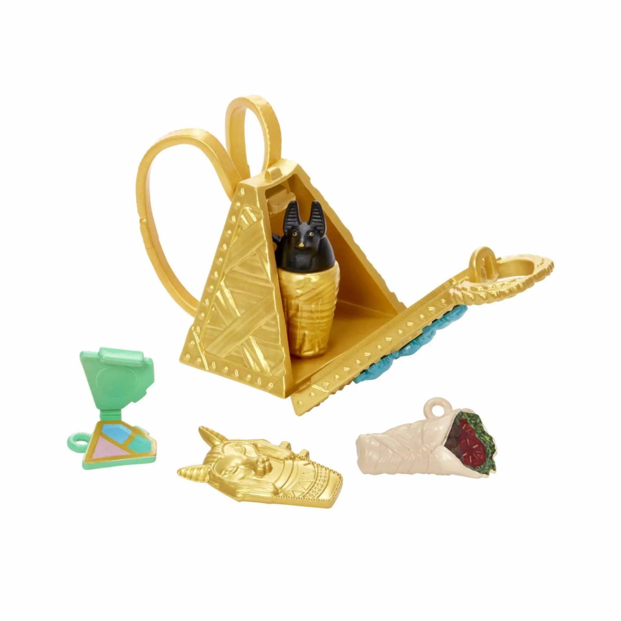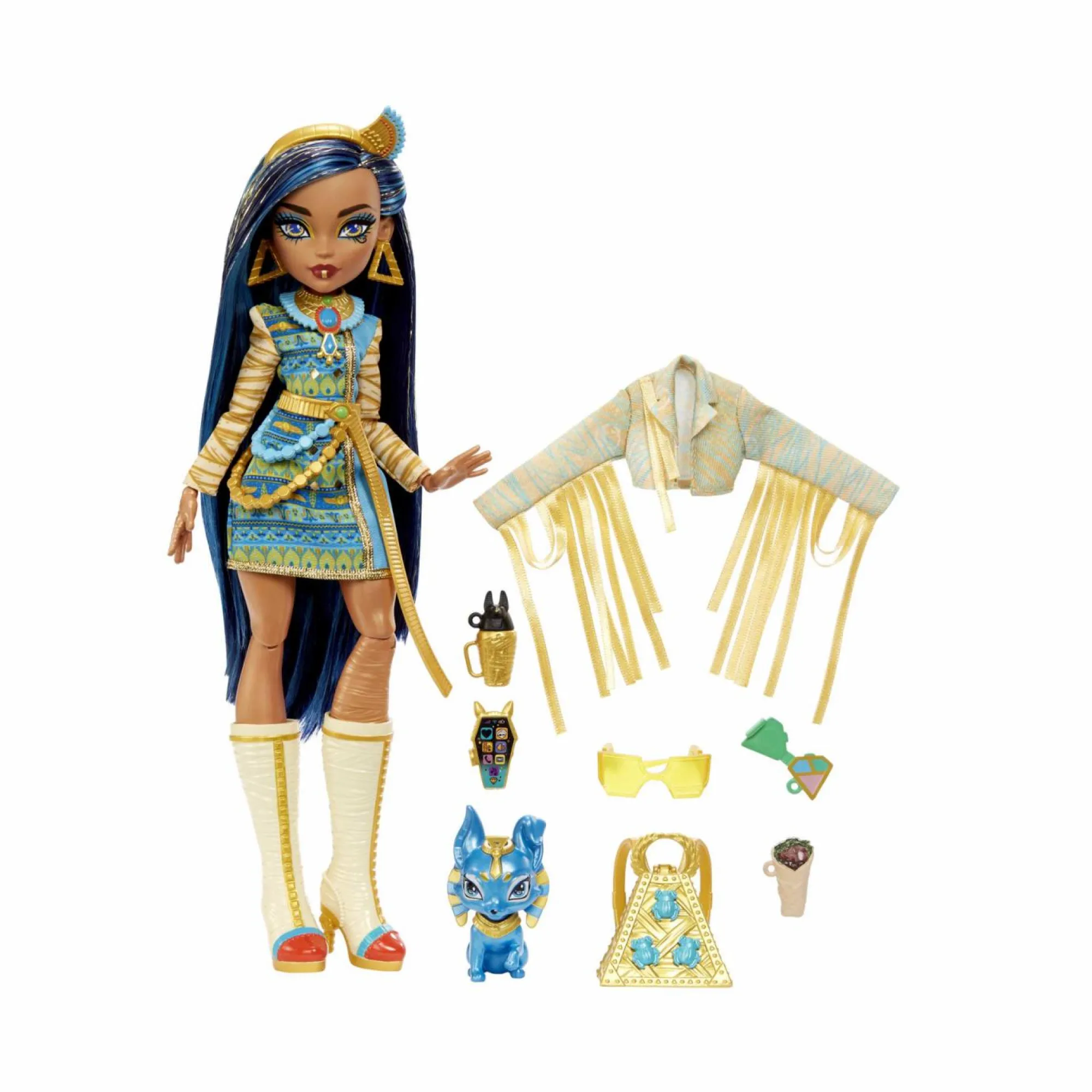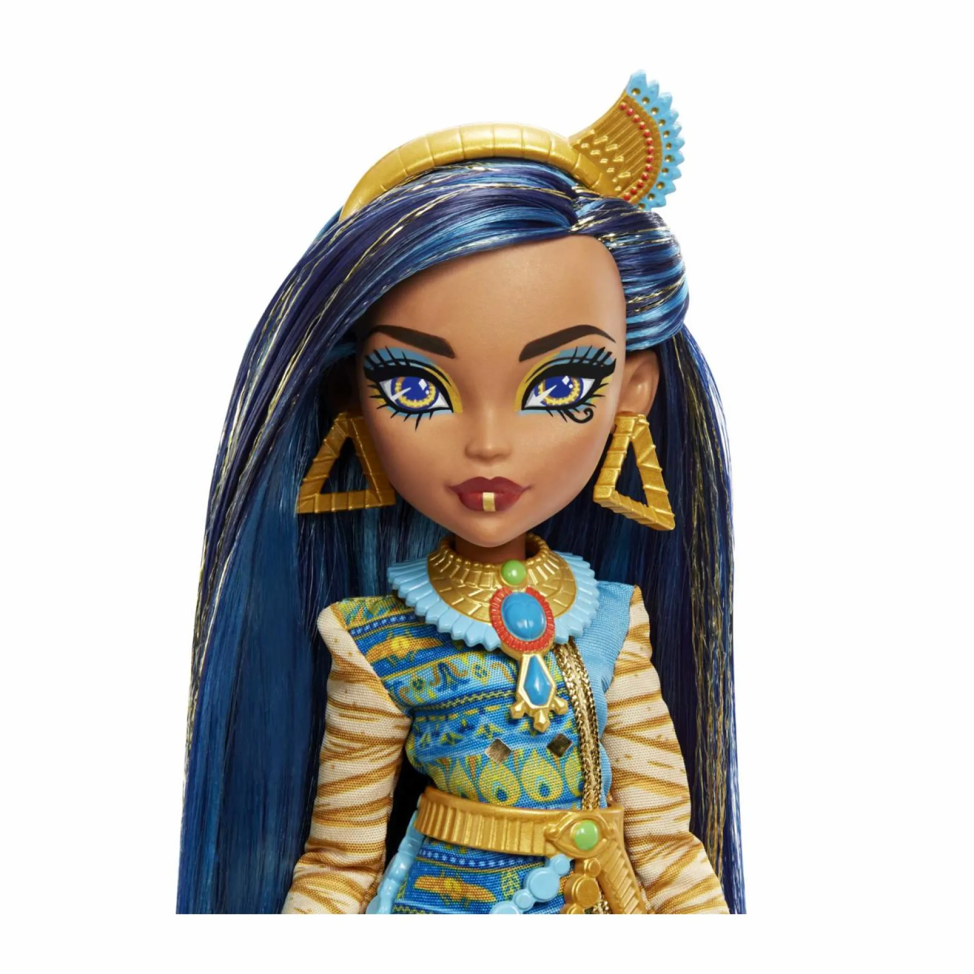 La bambola Cleo De Nile indossa un look regale, con abito blu e oro, maniche in stile mummia e una cintura a catena spaventosamente chic.