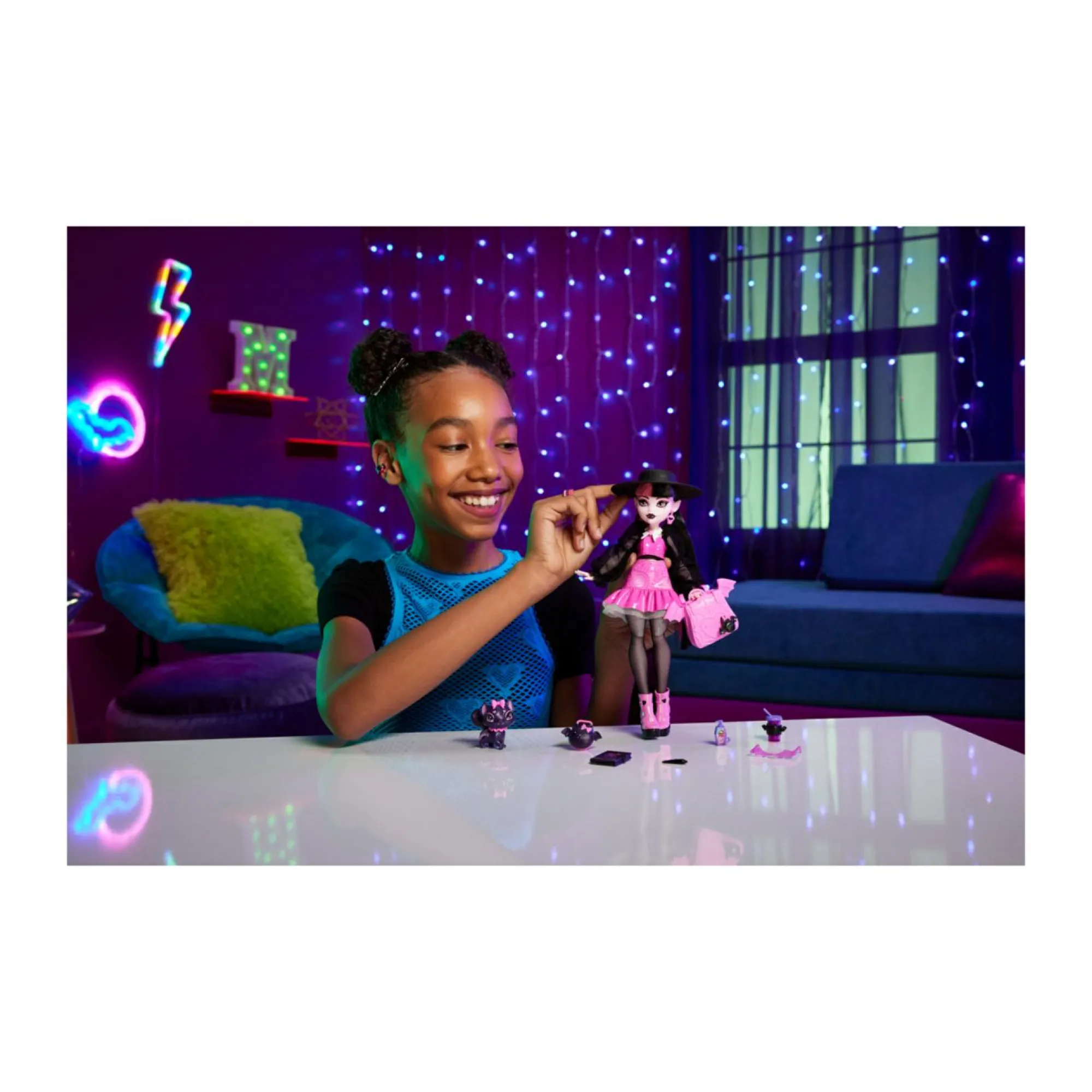 Monster High Draculaura sfoggia un look mostruoso in un abito da paura! Include il suo cucciolo Conte Favoloso e accessori da brivido.