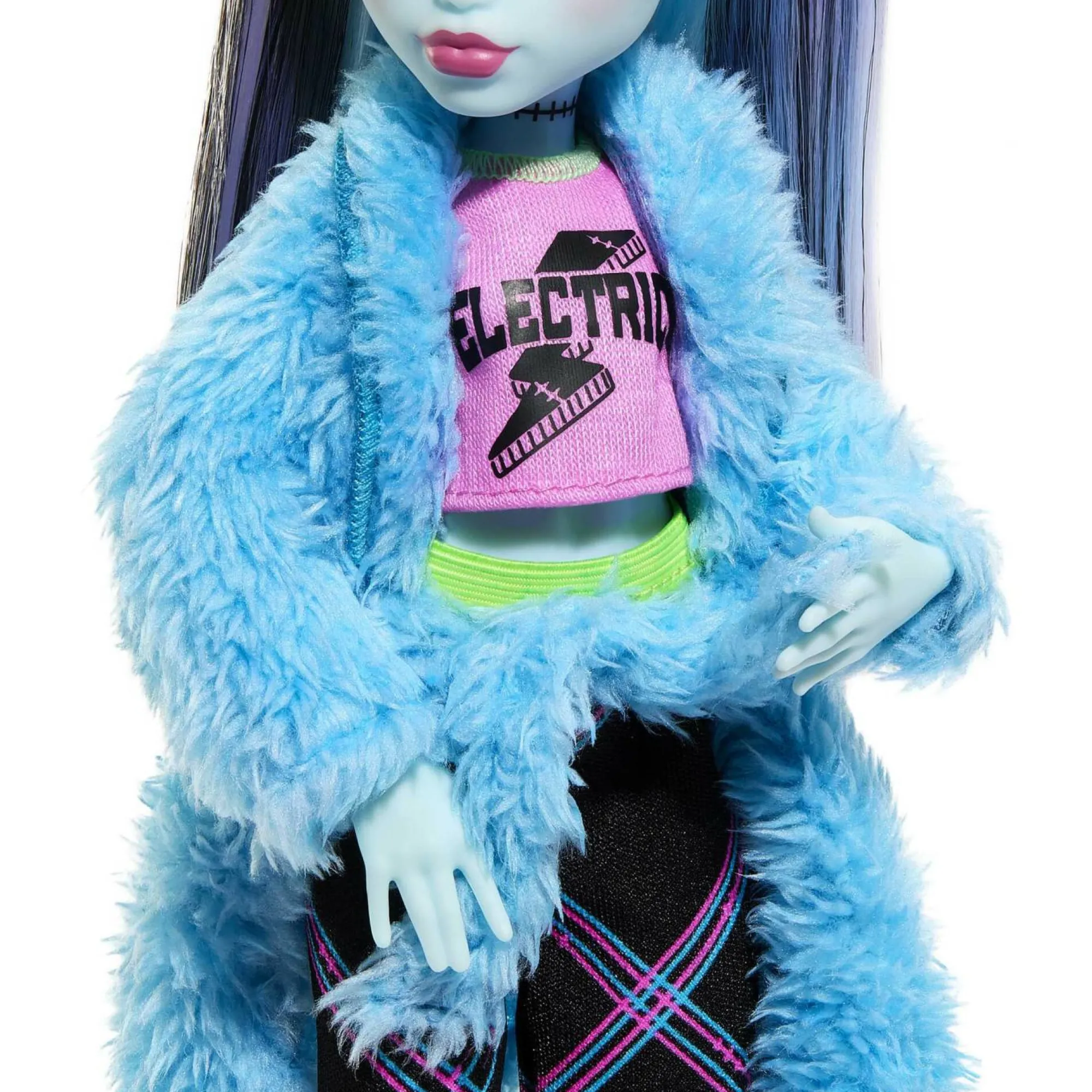 Questa mostramica sfoggia un look elettrizzante con un’elegante coda di cavallo con ciocche blu, stivali verdi asimmetrici e un cerchietto con dettagli di fulmini.