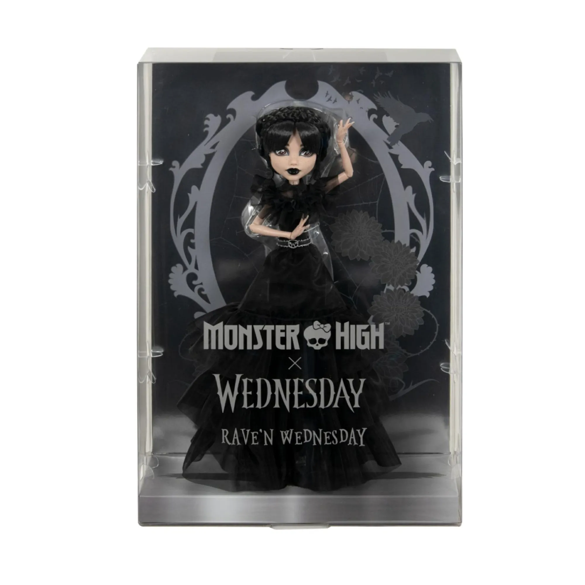 Una triste serata! L’abito nero di mezzanotte, un abito vintage ispirato a quello del suo personaggio nella scena del ballo scolastico presente nella serie, dona alla bambola Rave’N Mercoledì uno stile gotico glam.