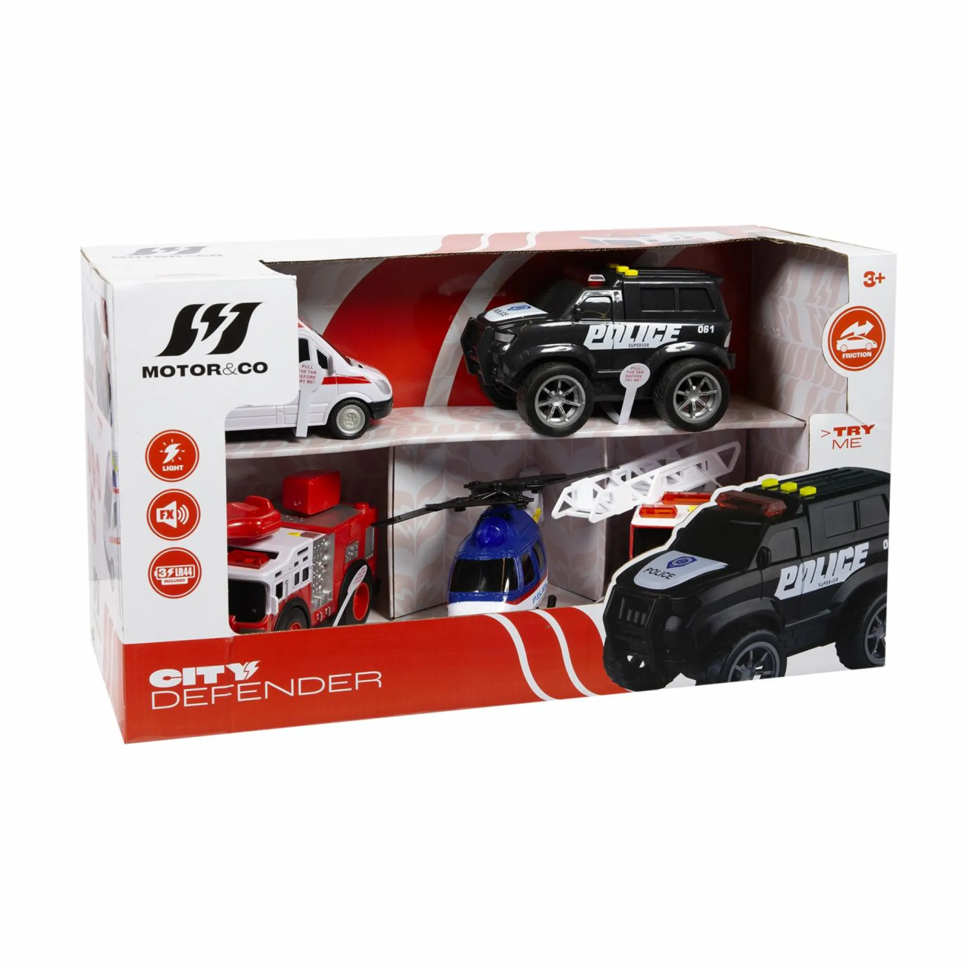 Sventa ogni pericolo con il set di veicoli City Defender! Polizia, pompieri, ambulanza, tutto quello di cui hai bisogno per salvare la città!
