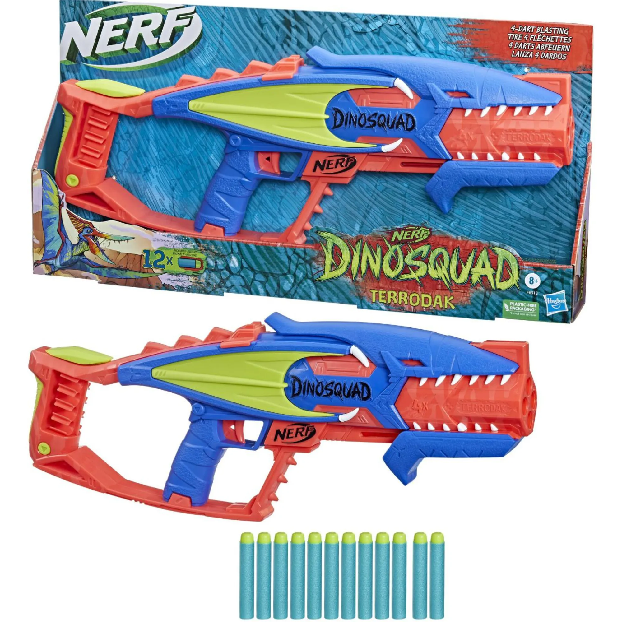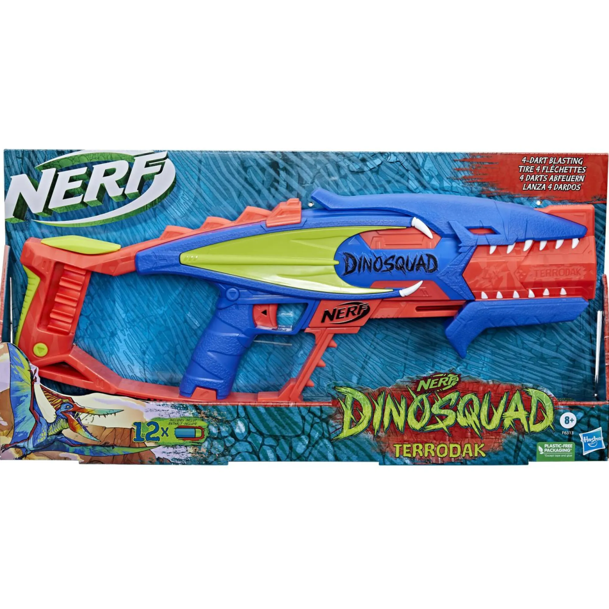 BLASTER DA 4 DARDI: lancia 4 dardi di fila con il blaster Nerf DinoSquad Terrodak! Prendi la mira e fai volare i dardi mentre ti lanci nell’azione con questo blaster a tema dinosauri