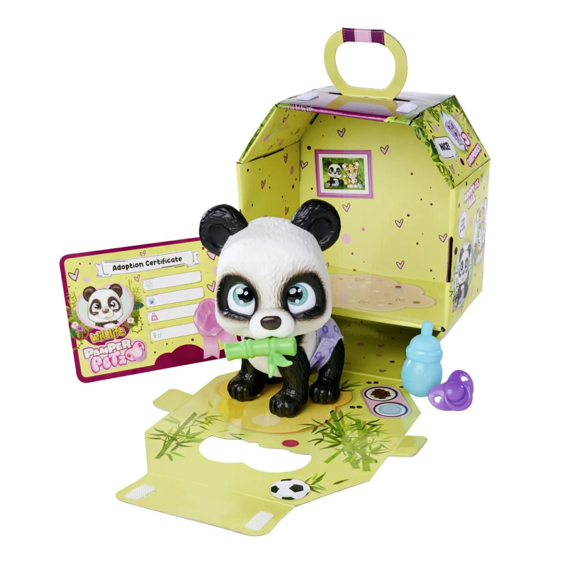 Incluse tante sorprese: la confezione può essere utilizzata anche come trasportino, all’interno si trova un vero certificato di adozione, un biberon, un pannolino, un gioco ed un ciuccio