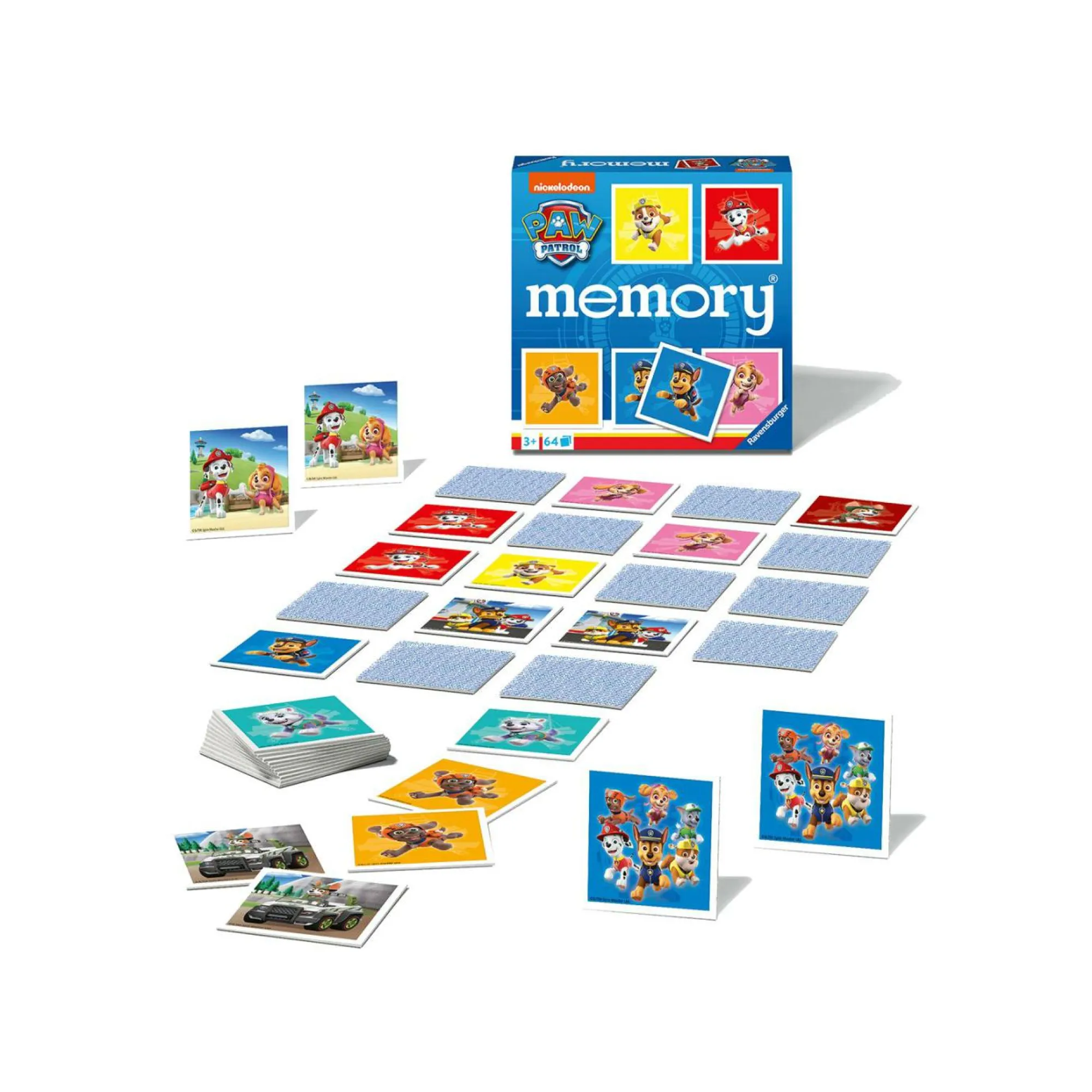 Il memory di Paw Patrol contiene 64 tessere di cartone con 32 immagini raffiguranti personaggi e luoghi d’animazione di Paw Patrol