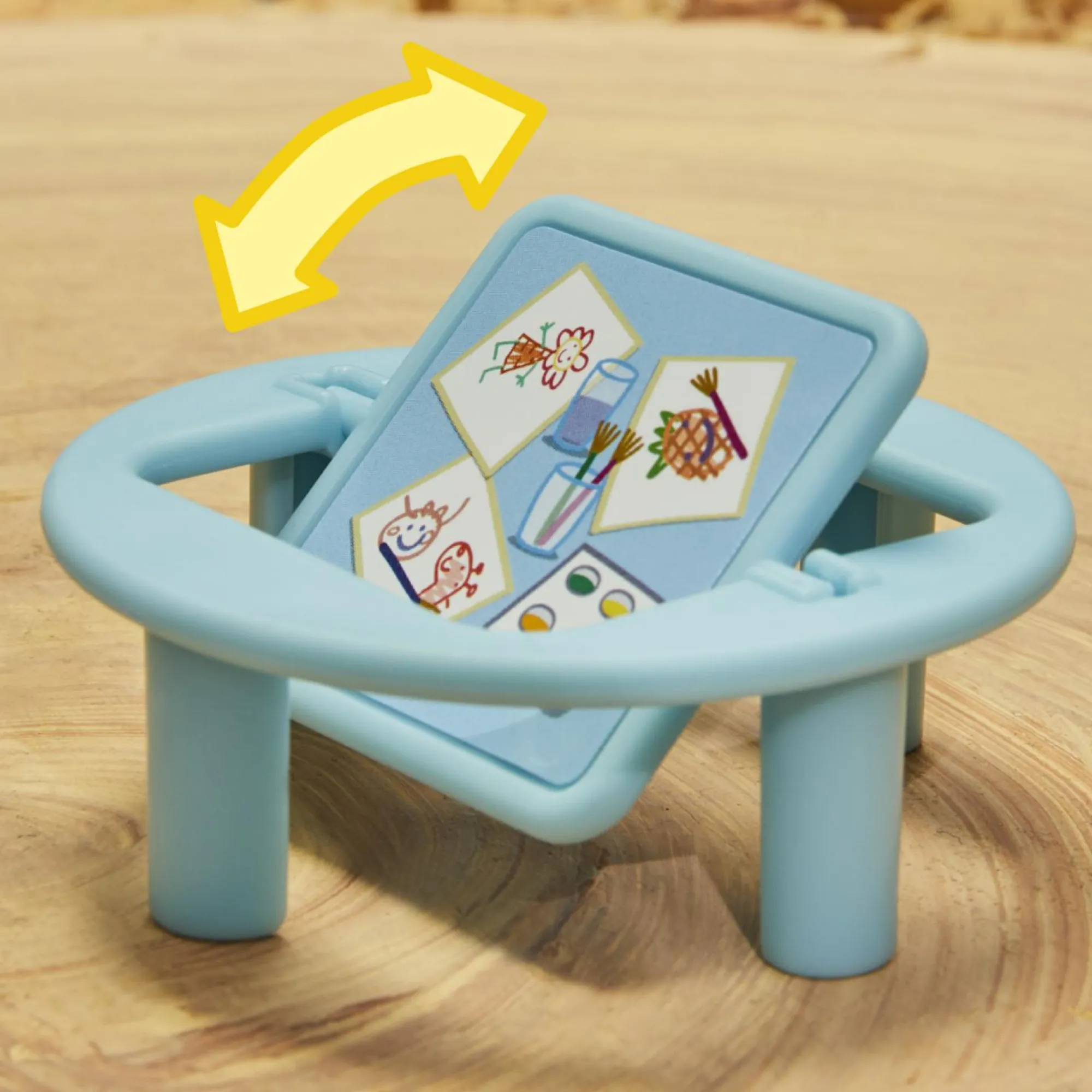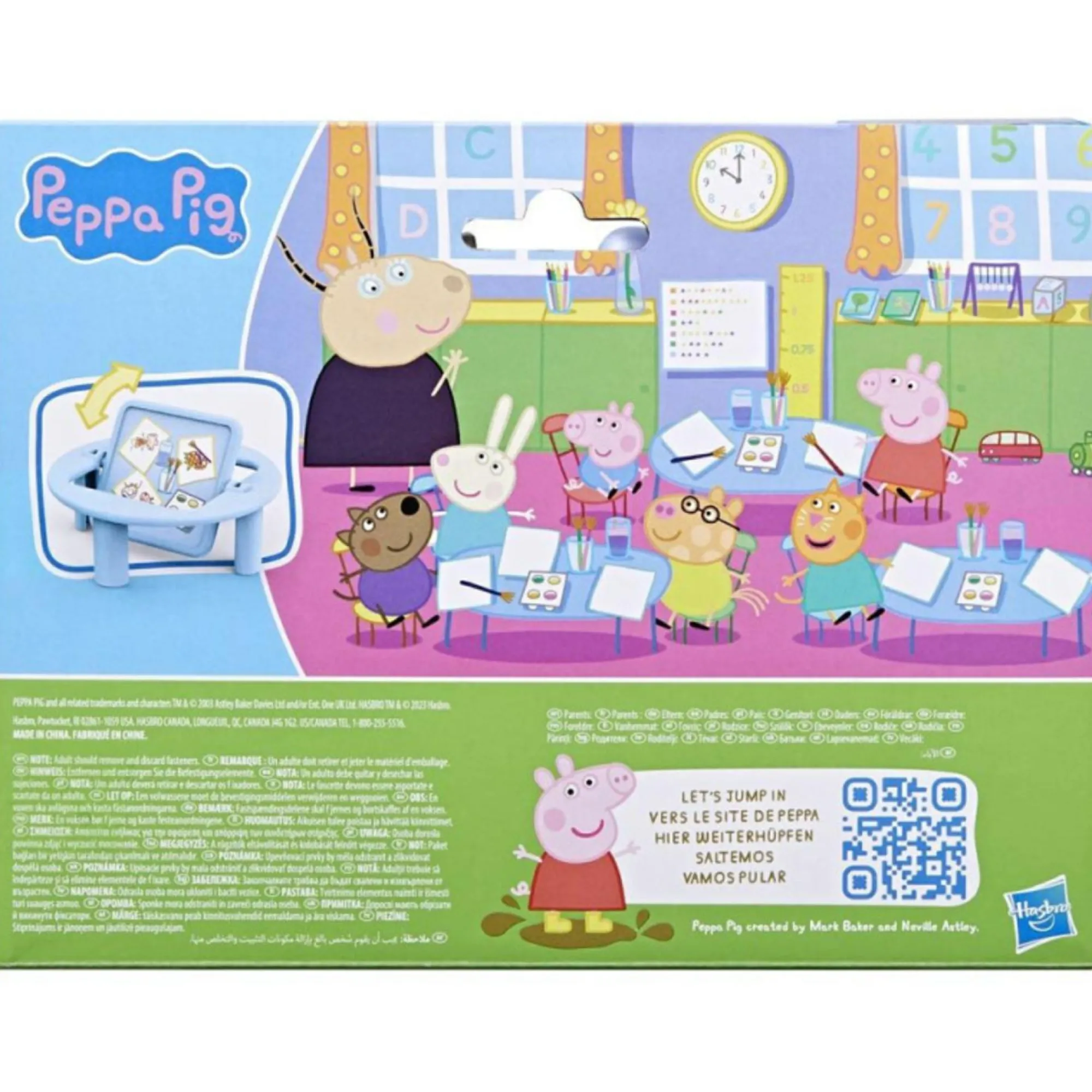 6 ACCESSORI PER LA CLASSE: allestisci lo spazio della classe di Peppa con 4 sedie, una lavagna per le prime lezioni e un tavolo che magicamente raffigura le creazioni artistiche della classe e, se capovolto, i piatti per l’ora di pranzo