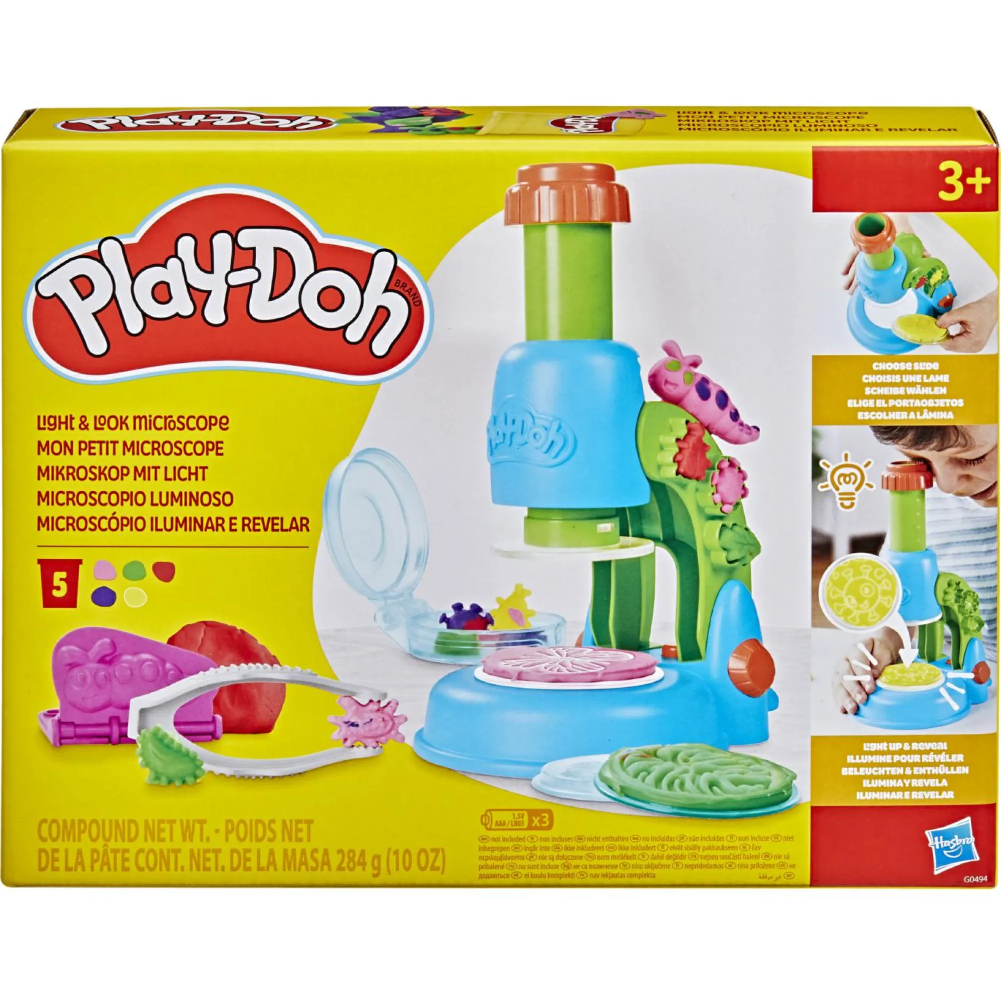IMMAGINA DI ESSERE UNO SCIENZIATO: esplora con questo microscopio giocattolo di Play-Doh che si illumina davvero. Crea i vetrini da analizzare al microscopio modellando sul tappetino da gioco a tema naturalistico