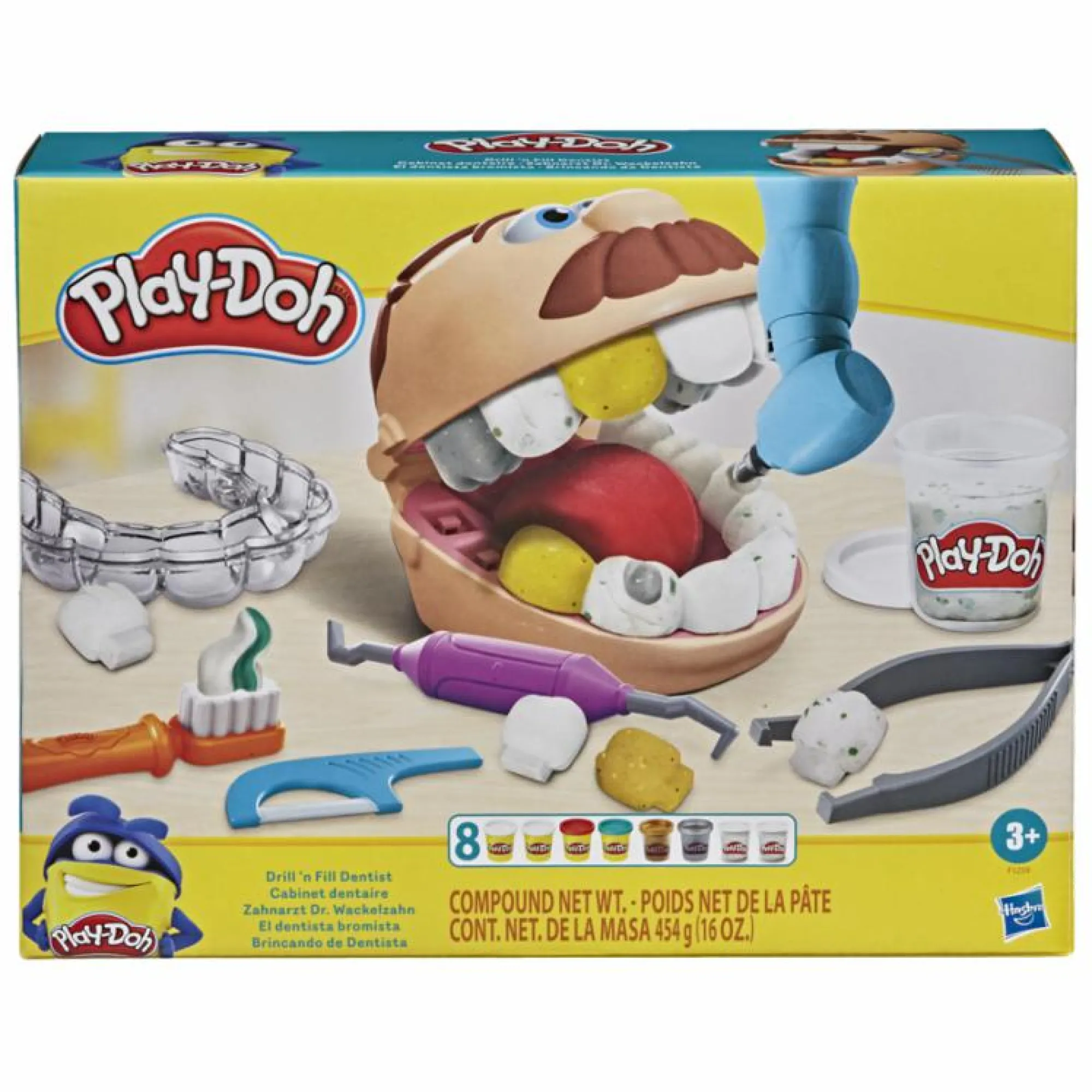 TRAPANA E CURA I DENTI PLAY-DOH: Usa il trapano manuale giocattolo per penetrare quelle carie, poi schiaccia le otturazioni Play-Doh dalla siringa per curarle