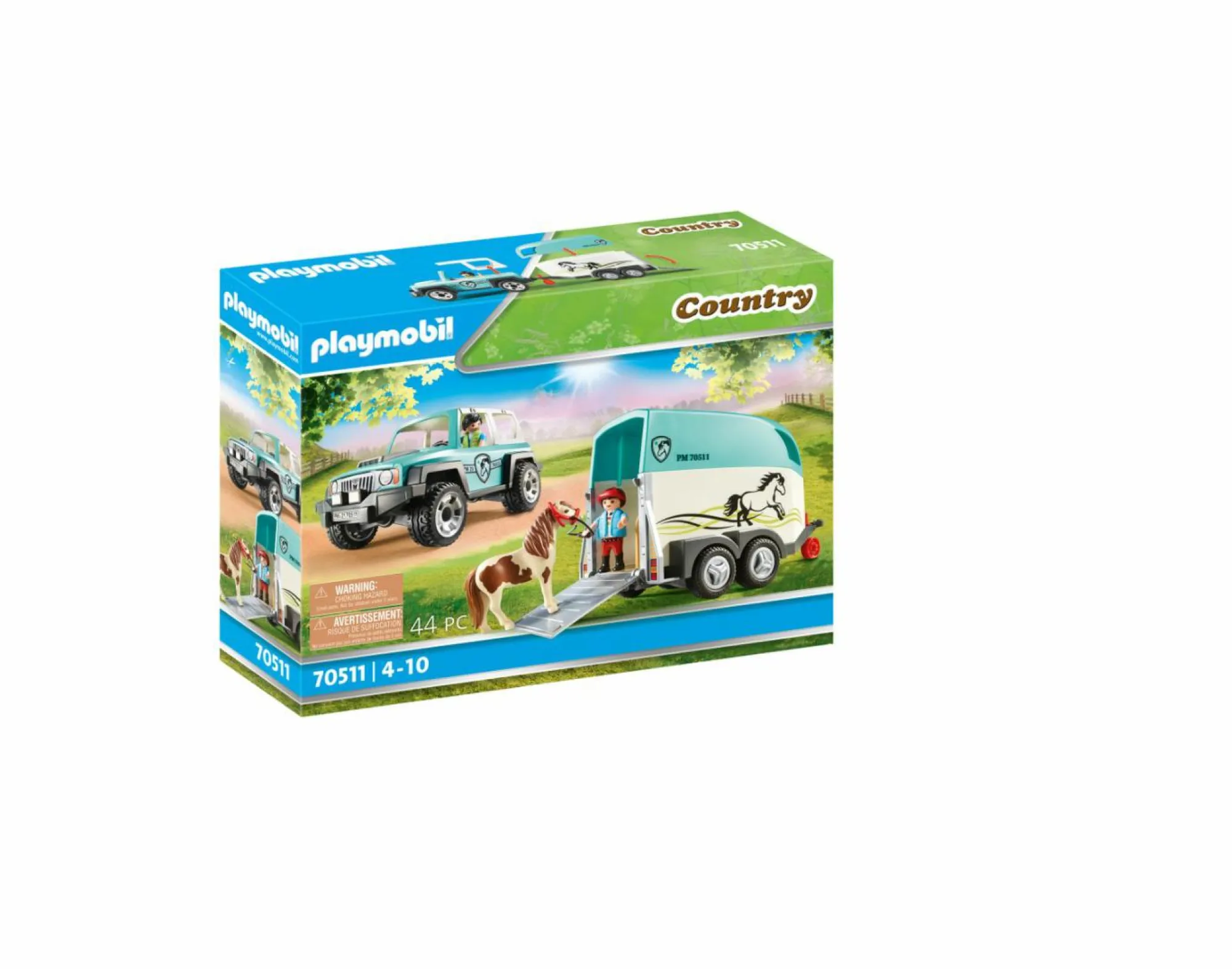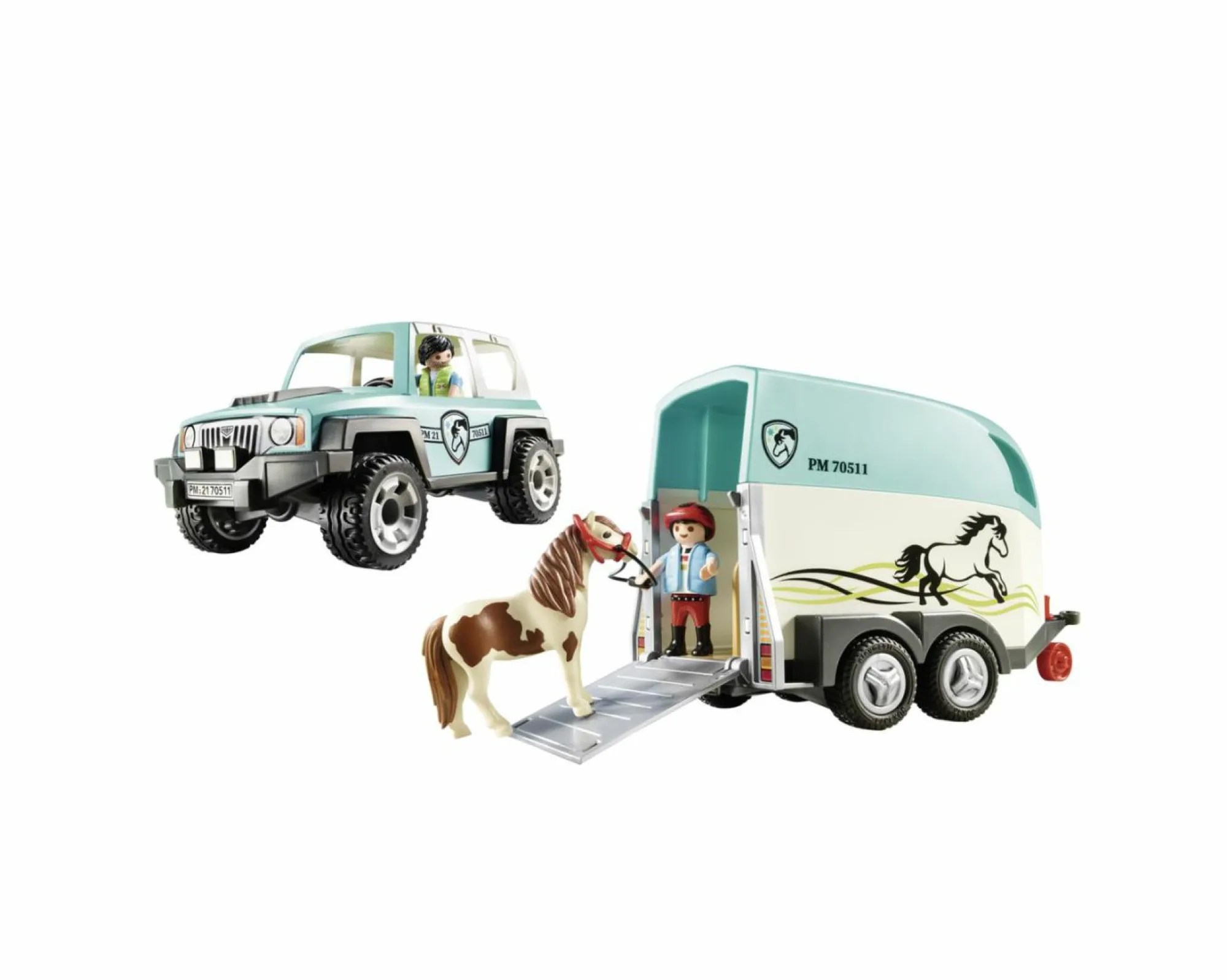 Il set include un fuoristrada con rimorchio, due personaggi PLAYMOBIL, un pony e molto altro. Il tetto dell’auto e del rimorchio sono removibili.”