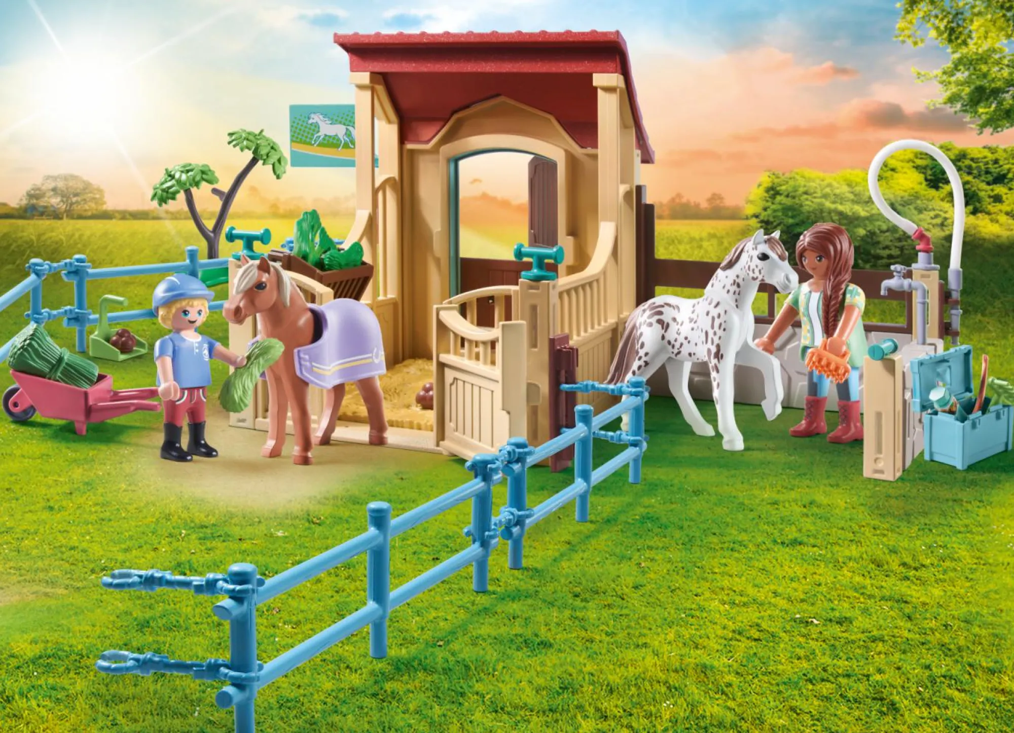 Il set comprende una stalla, un personaggio PLAYMOBIL, due pony, un box per cavalli con area di lavaggio, elementi di recinzione e numerosi accessori per la cura dei cavalli.