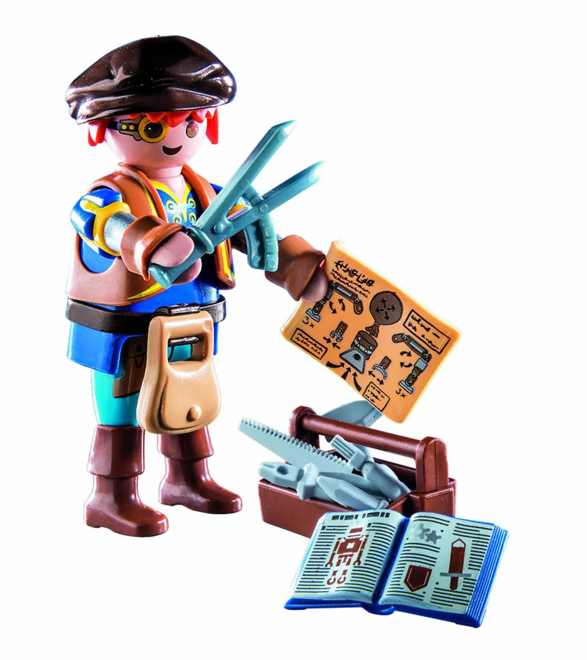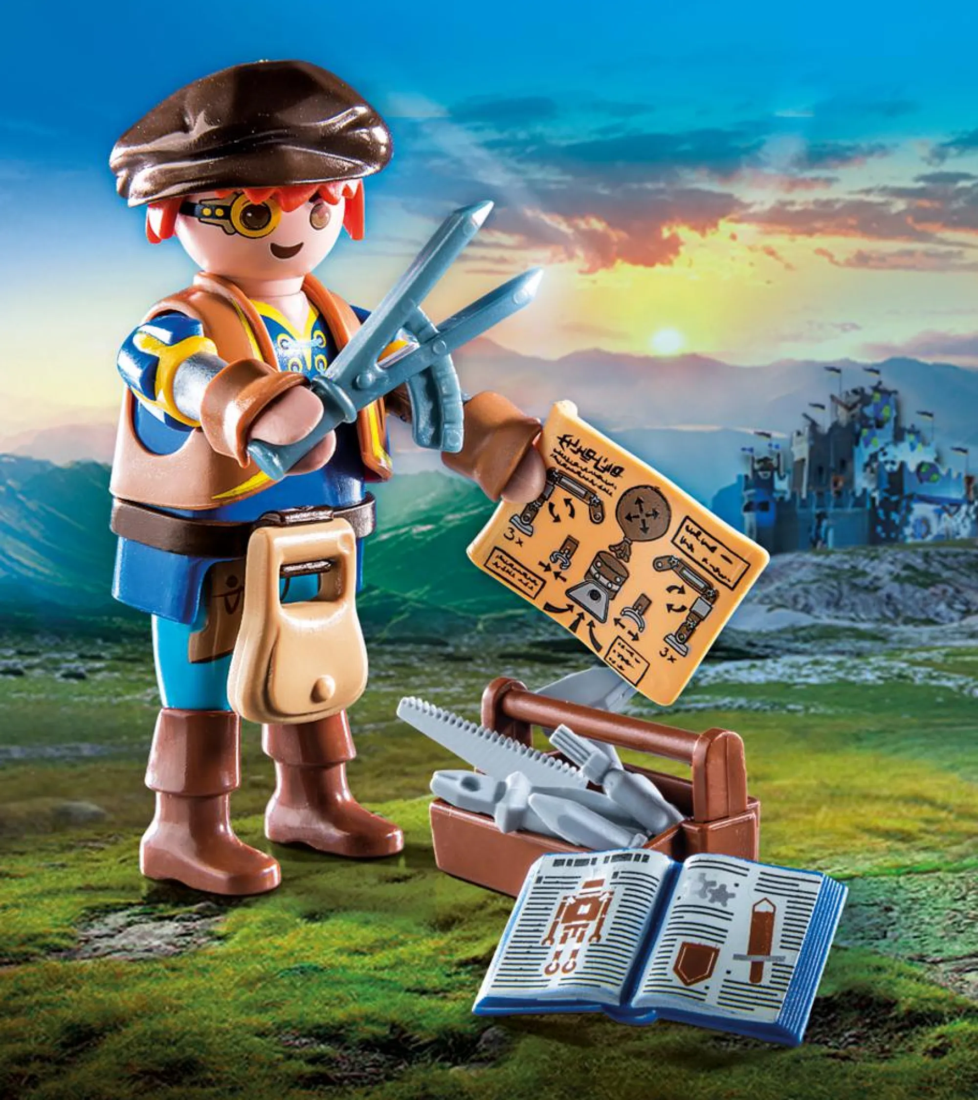 Il set include il personaggio di Novelmore Dario con cappello, borsa, libro, cassetta degli attrezzi e altri extra