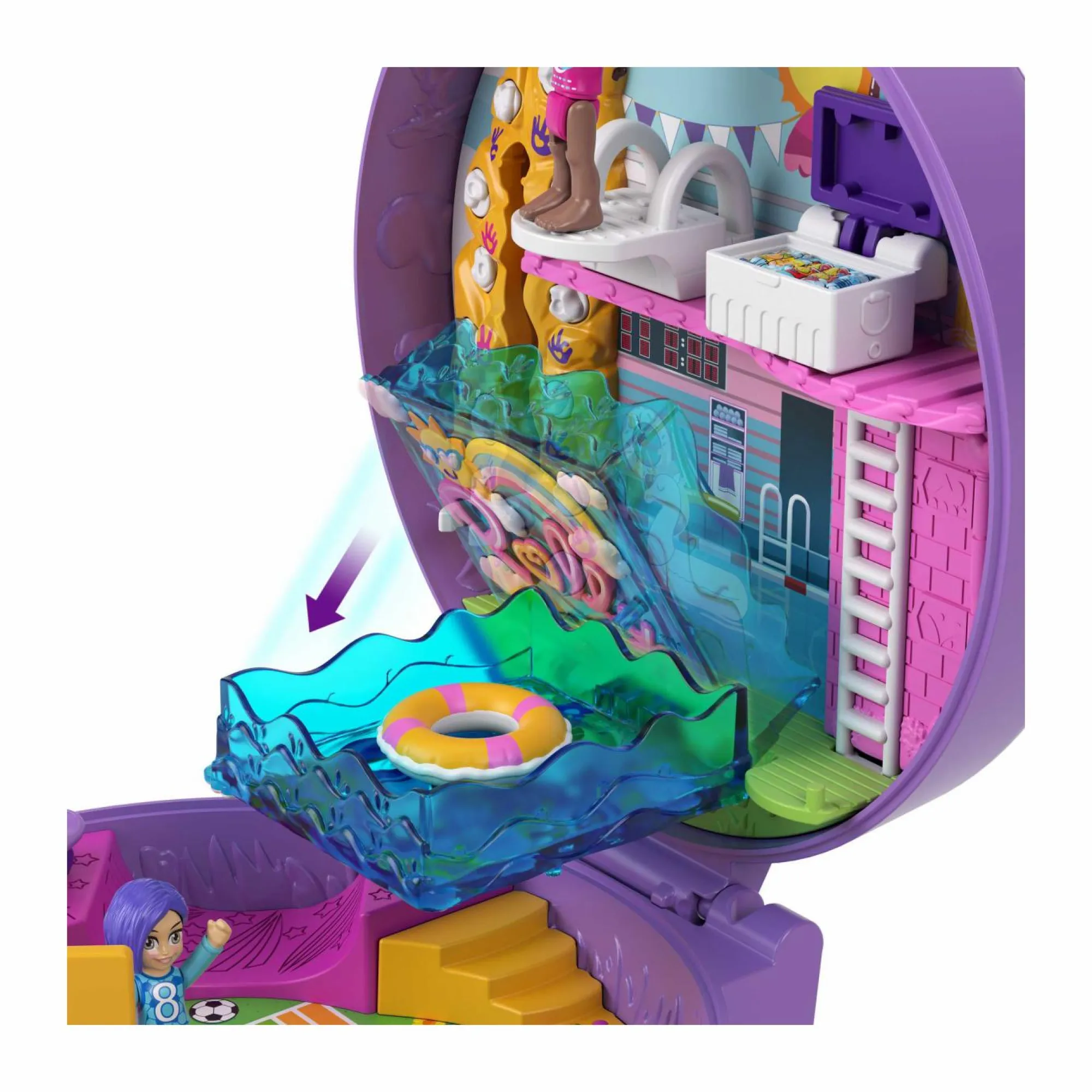Scopri le tantissime attività divertenti: aggancia una delle bambole alla parete da arrampicata, abbassa la piscina per fare qualche vasca, fai un paio di canestri, muovi la palla da volley avanti e indietro sulla rete e apri il frigorifero a pozzetto per rifocillarti con qualcosa di fresco.