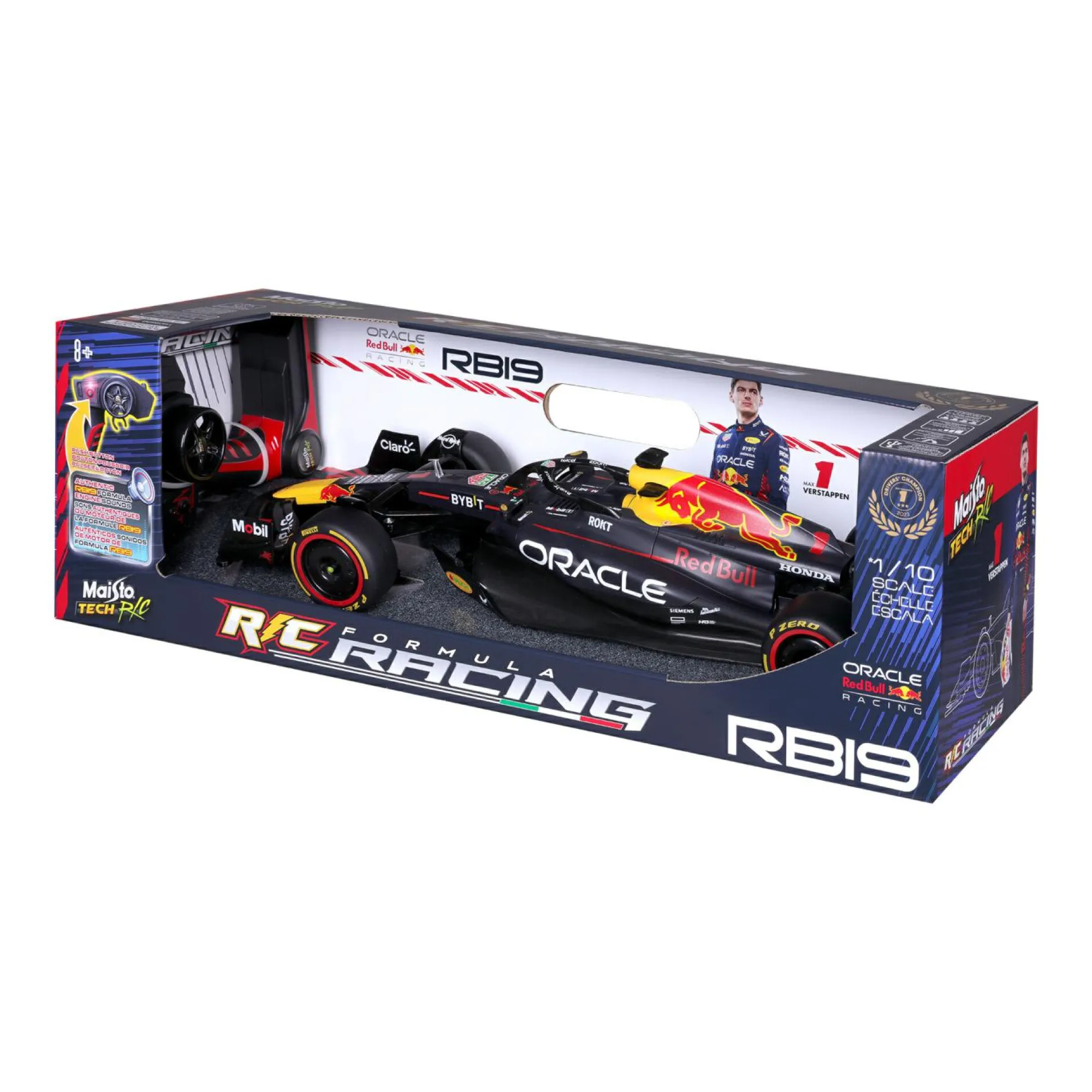 RC Maisto Tech con licenza ufficiale Red Bull. Modello Oracle Red Bull Racing RB19 F1 Pilota #1 Verstappen. 7 funzioni. 2.4 GHz. Fino a 4 giocatori. La regolazione proporzionale dello sterzo consente una massima precisione di movimento. Antenna incorporata. Il veicolo è dotato di tasto ON/OFF per accensione e spegnimento. Velocità di guida ≥4,5 m/s. Raggio di controllo del telecomando ≥35 metri (ambiente esterno aperto senza interferenze, batteria completamente carica). Dettagli autentici. Design realistico. Riproduce il suono della F1 in gara.