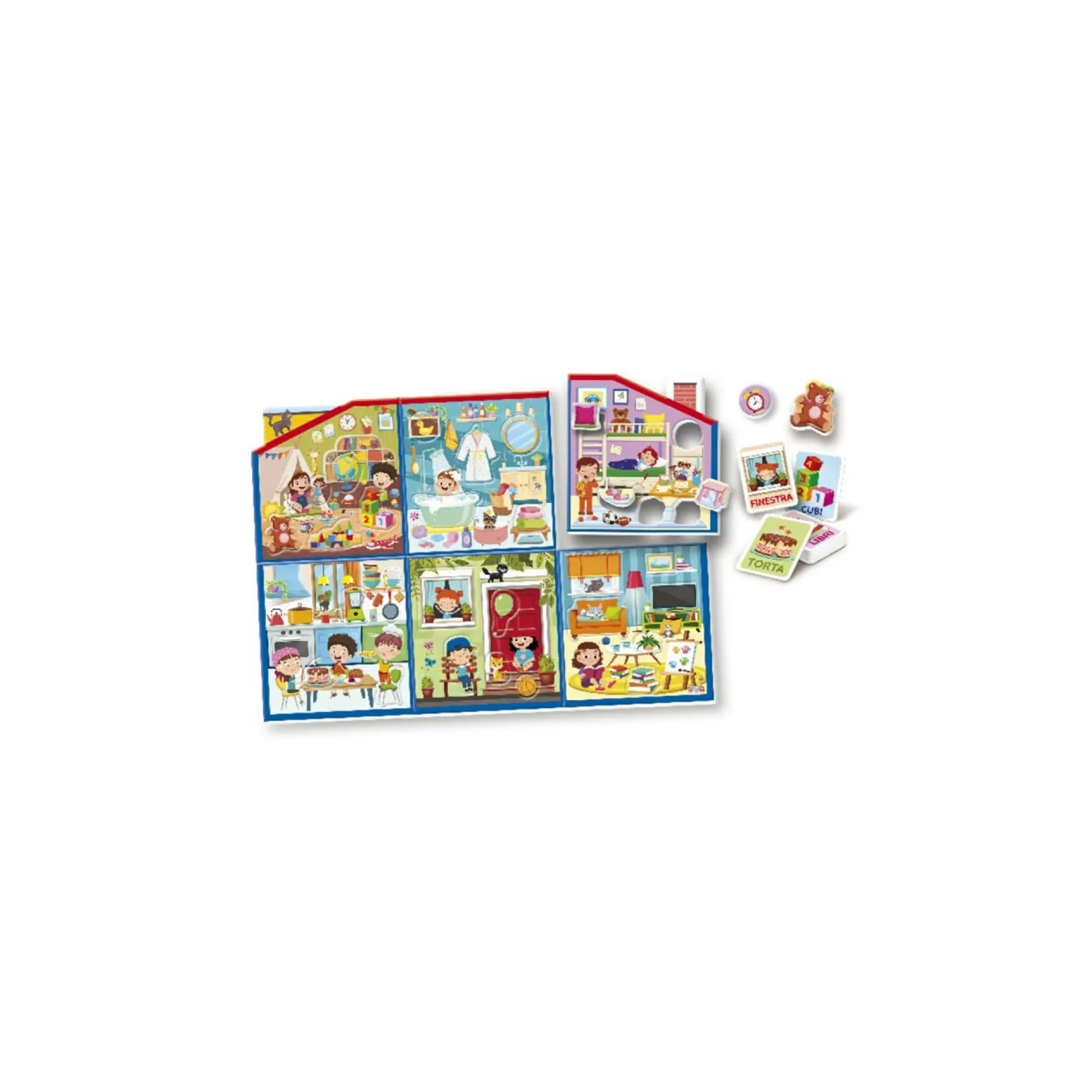 La confezione contiene un grande puzzle-casetta con 6 stanze in cui incastrare 30 oggetti sagomati.