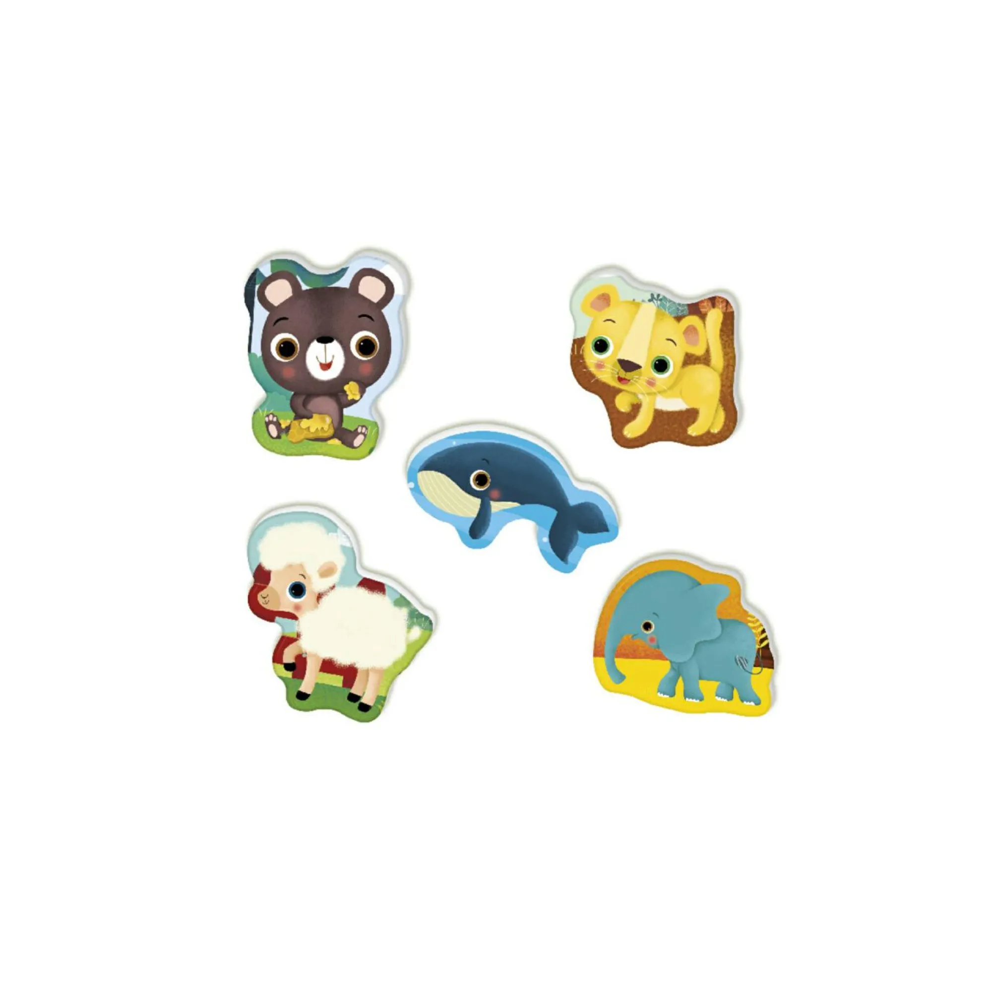 Contiene tante tessere di cartone con illustrazioni di teneri animali, in cui incastrare i cuccioli sagomati.