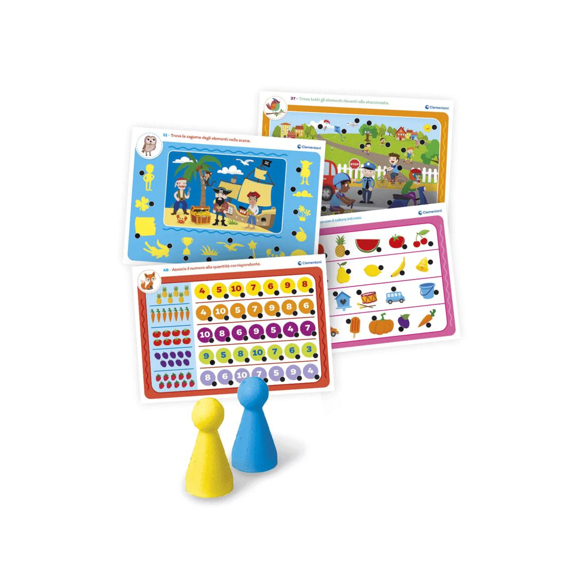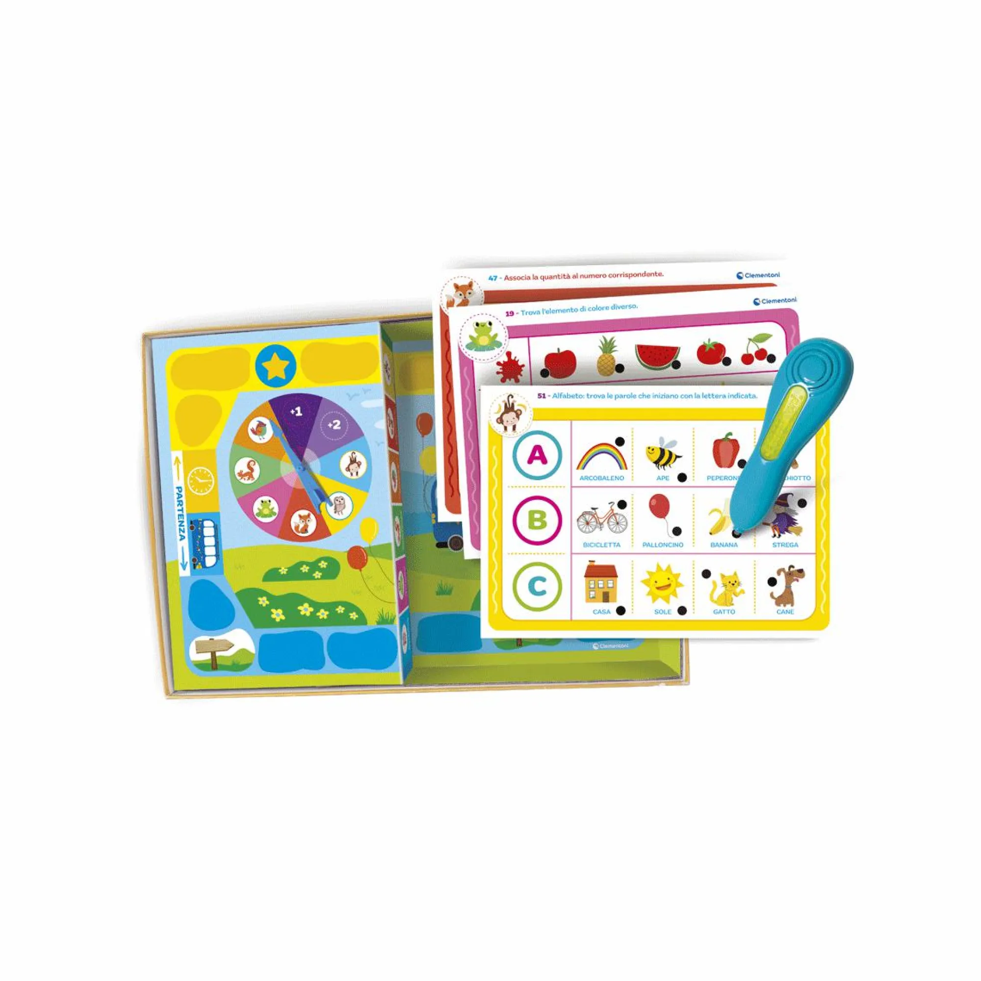 Un gioco educativo elettronico con 32 carte e 64 attività di gioco per imparare lettere, parole, numeri, quantità, forme e colori.