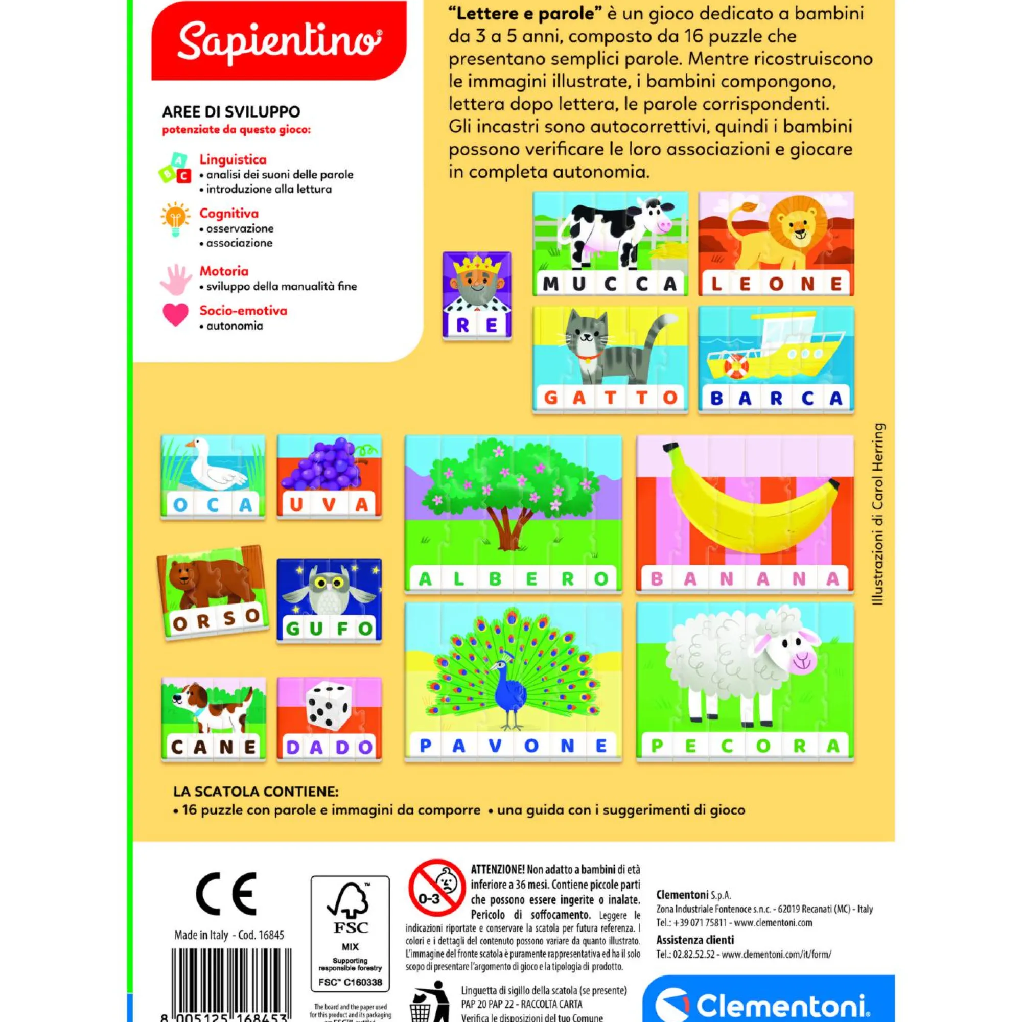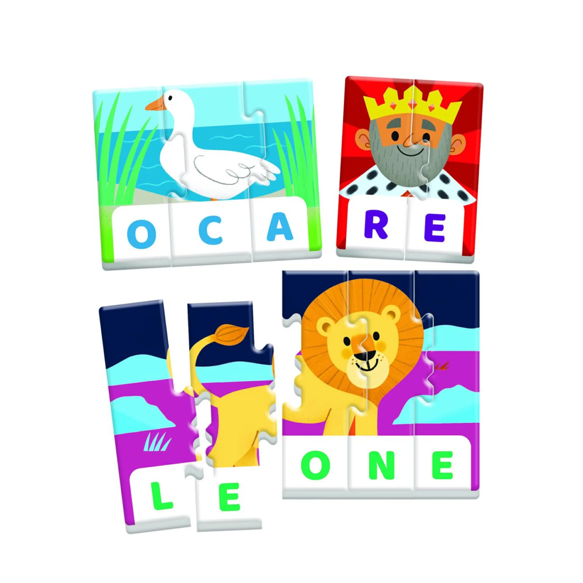 Include 16 puzzle a difficoltà progressiva e con incastri univoci, con i quali comporre immagini e parole.