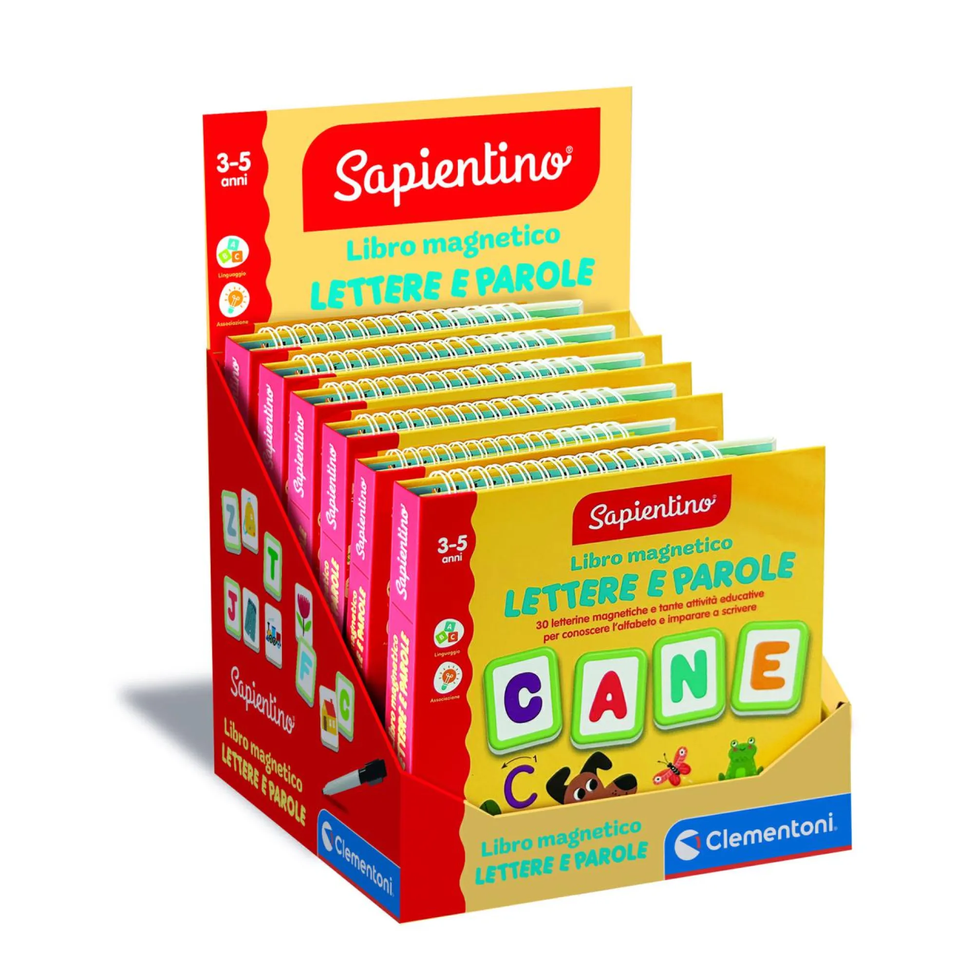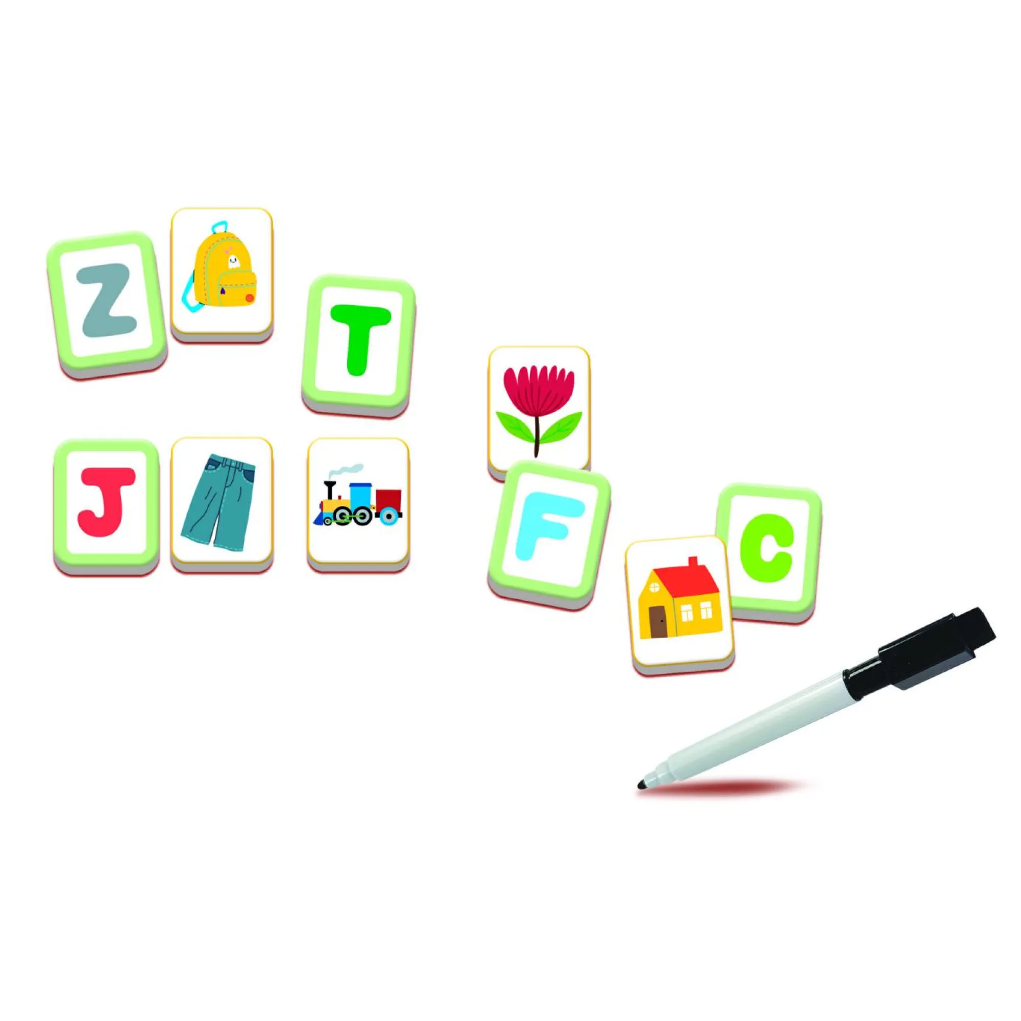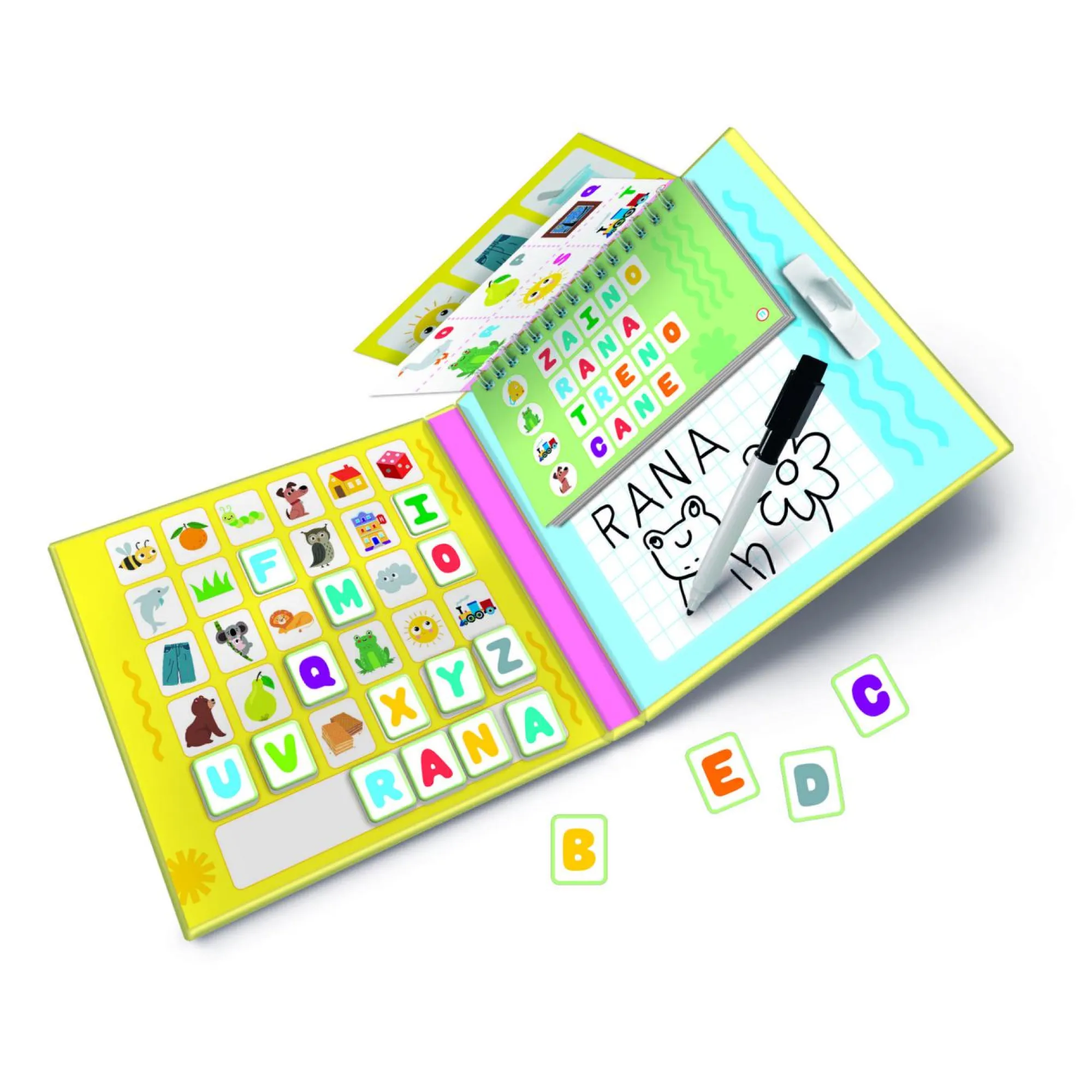 Include tessere alfabeto magnetiche, percorso educativo progressivo, un pennarello cancellabile e due aree di gioco per scrivere.