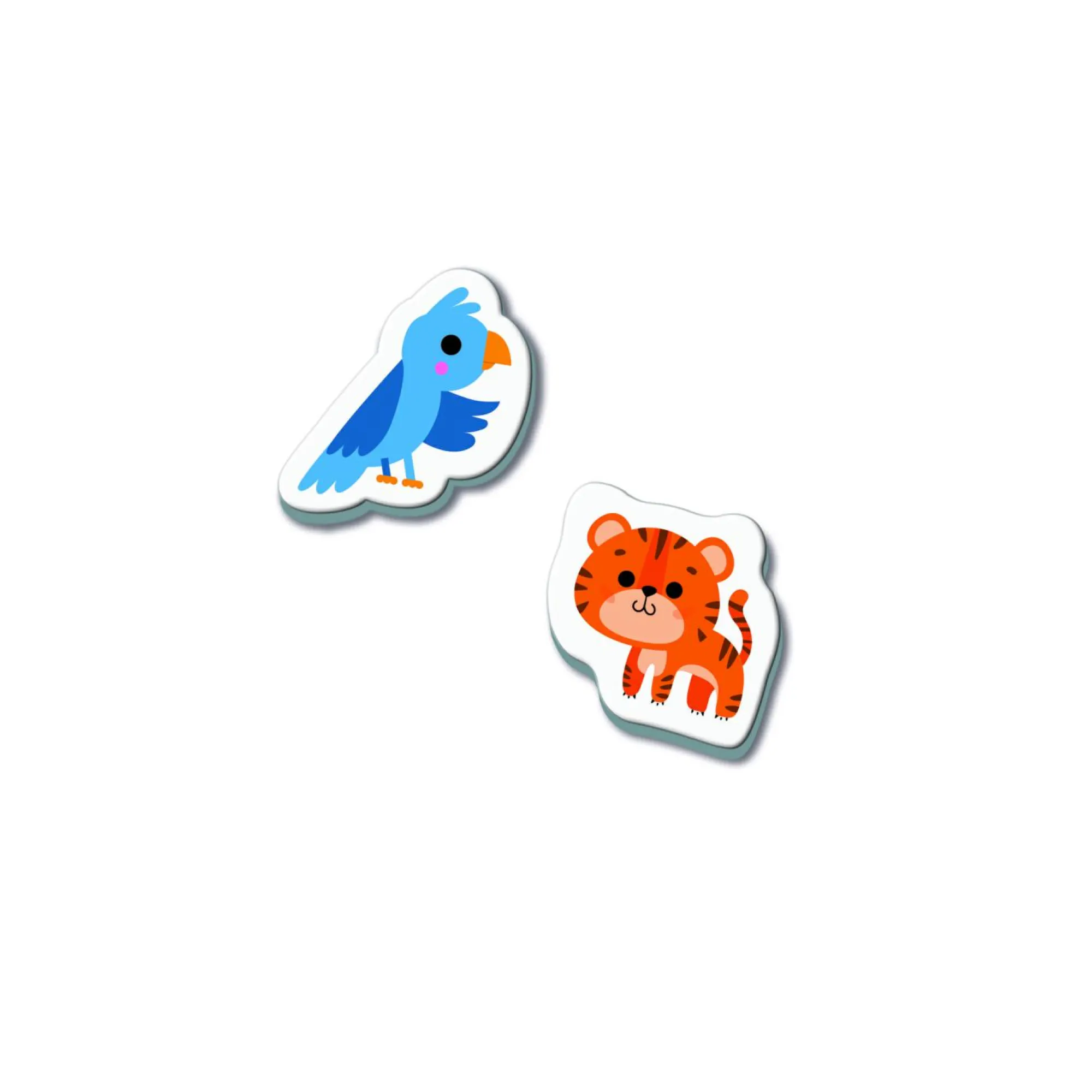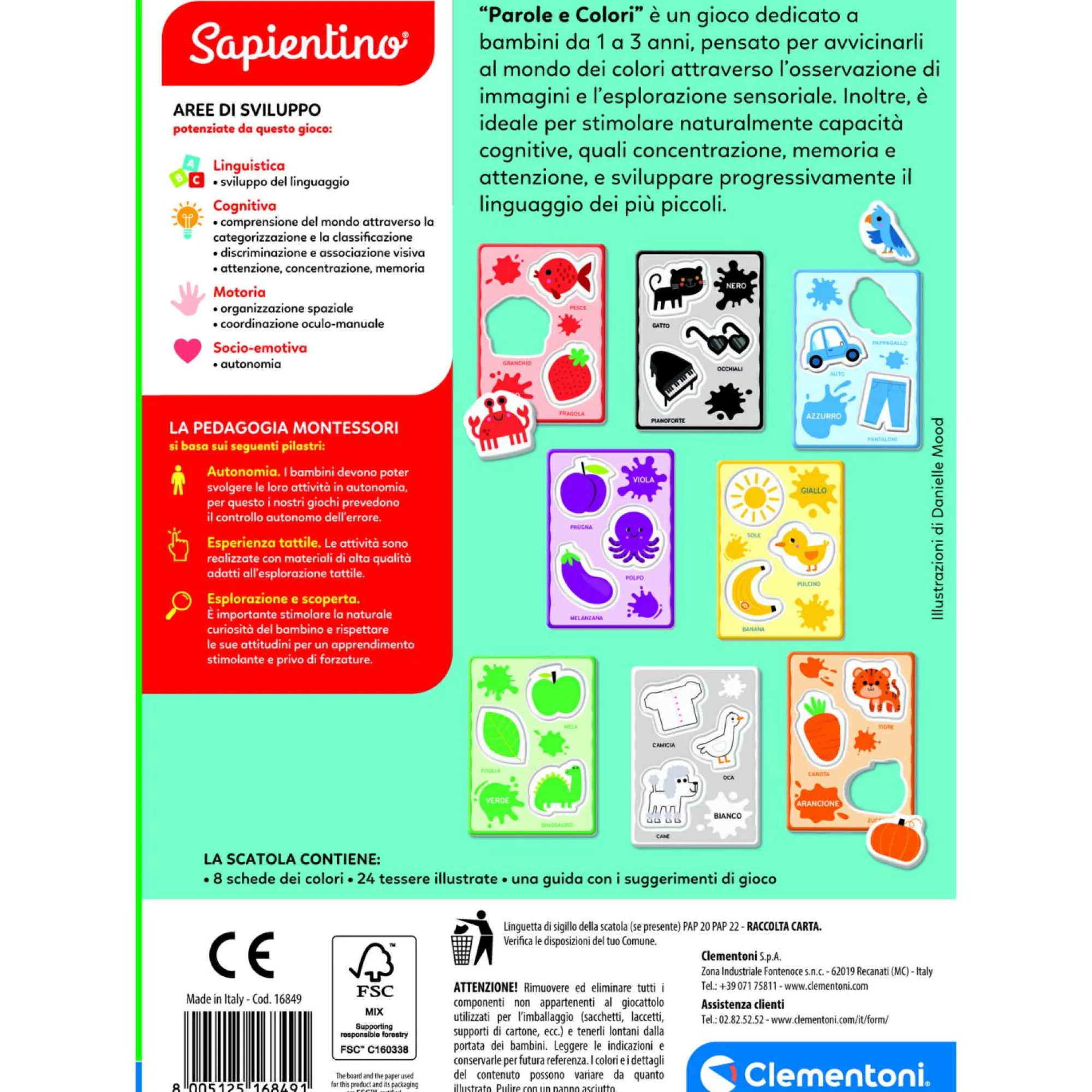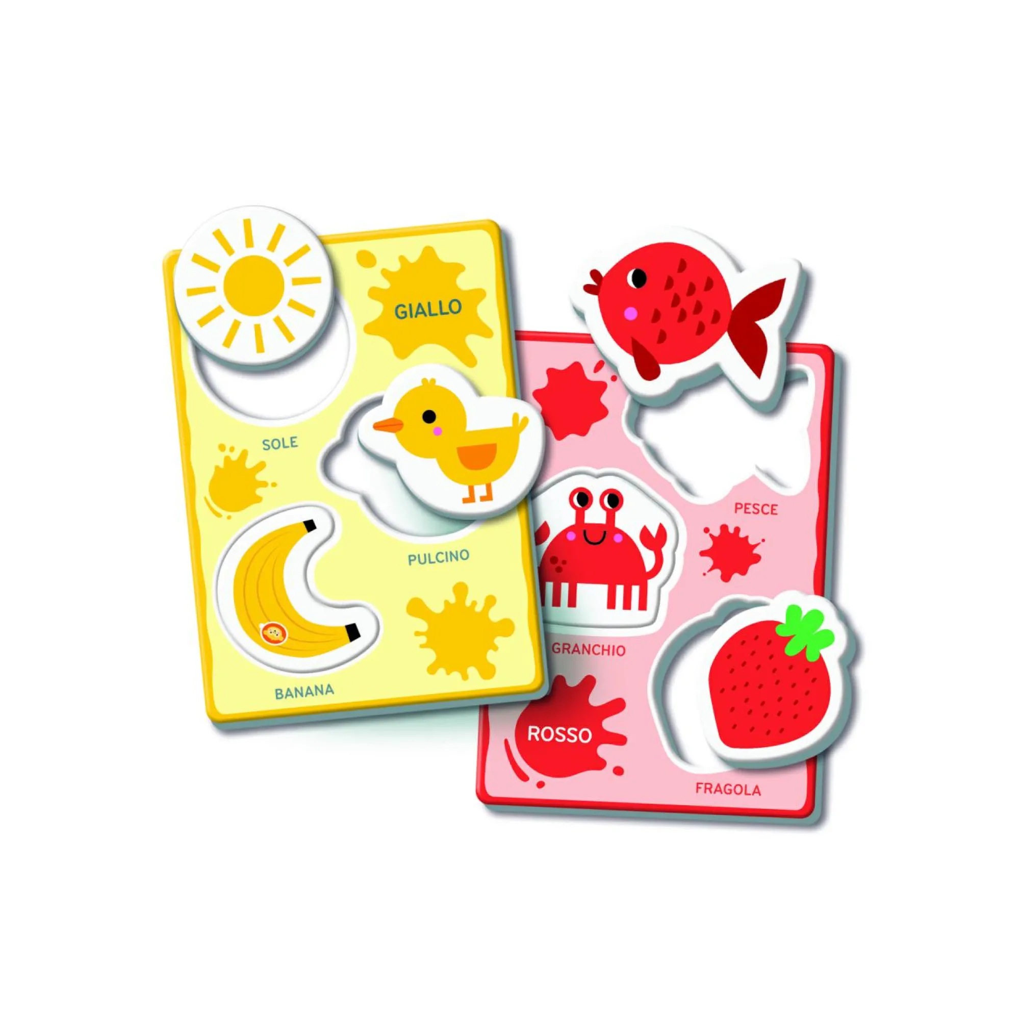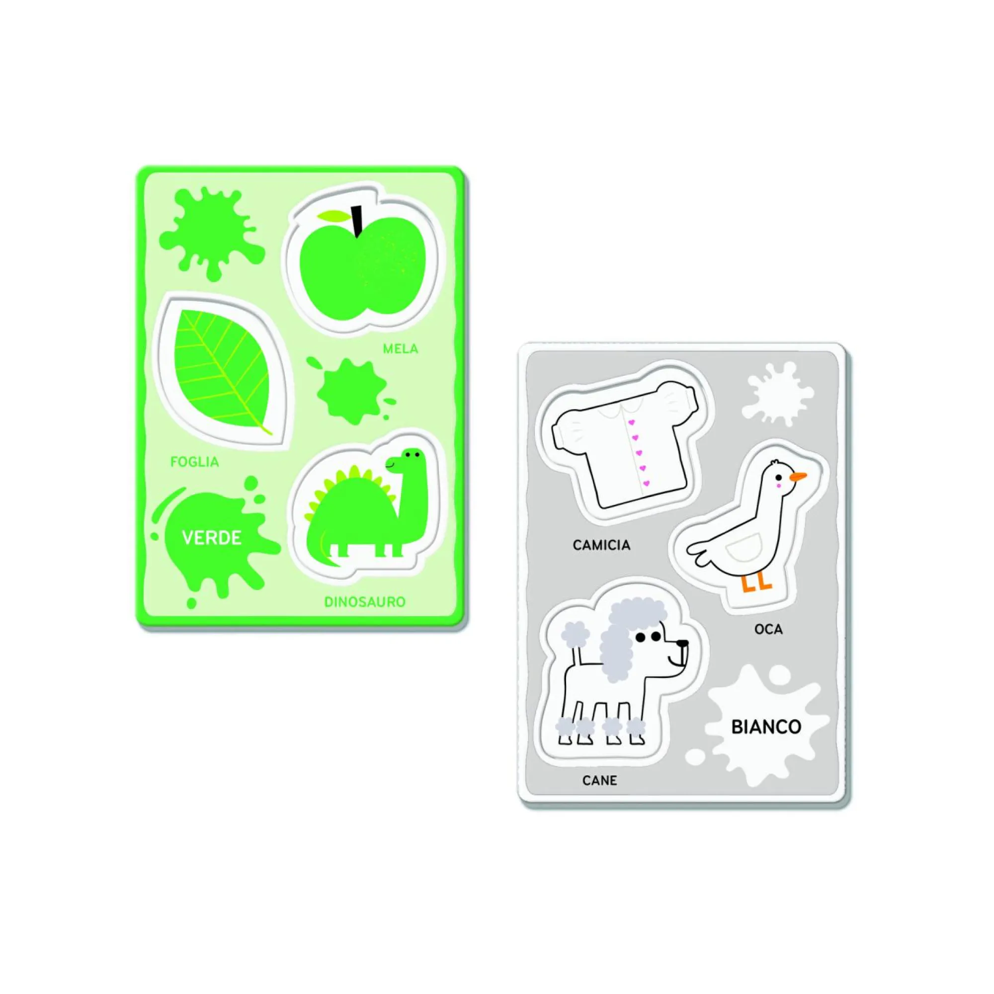 Include tanti soggetti sagomati da nominare e incastrare nelle grandi cartelle, in base al colore.
