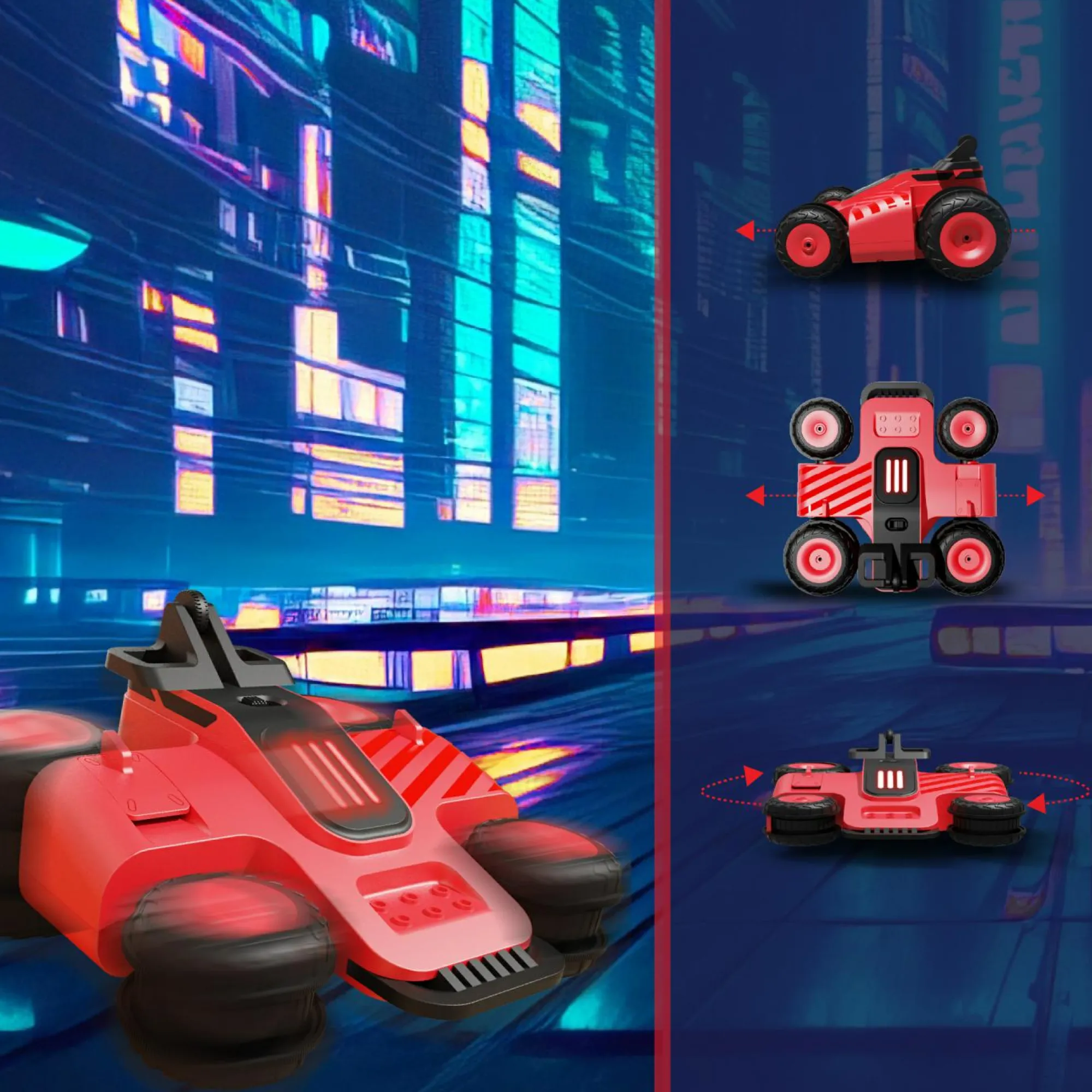 CAPACITÀ DI STUNT INNOVATIVE: le ruote ruotano di 90 gradi per acrobazie e manovre spettacolari, offrendo un’esperienza RC senza precedenti.