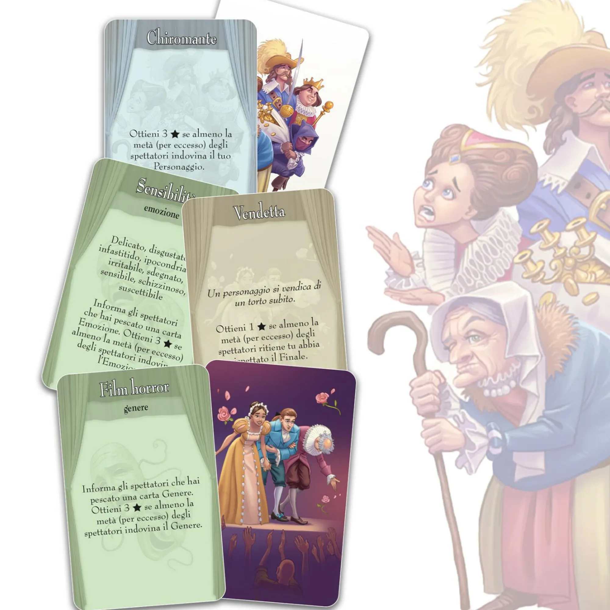 - Contenuto della confezione: 48 carte Personaggio10 carte Finale30 carte Qualità1 carta Primo Giocatore81 segnalini Punto1 bloc notes Tema1 bloc notes Spettatore1 Regolamento