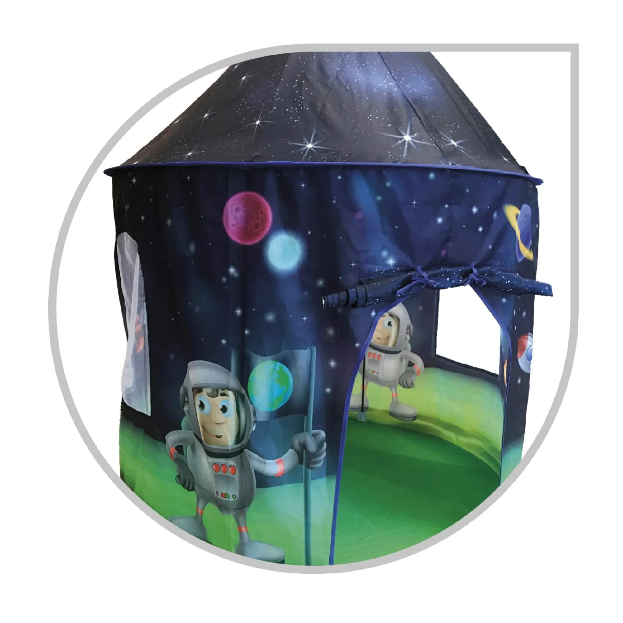 Viaggio intergalattico garantito – Tenda spaziale con stampe di pianeti, stelle e razzi per piccoli astronauti.