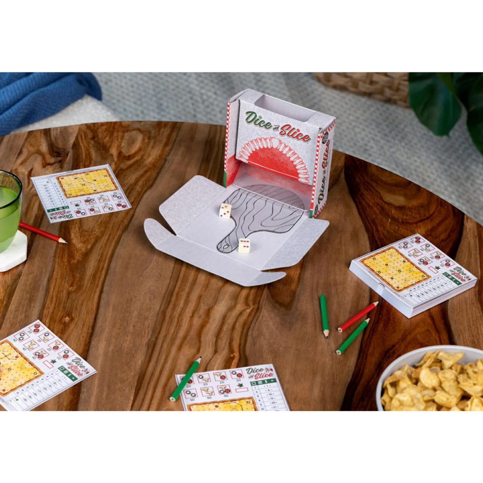 Apri la confezione e trasformala in una torre lanciadadi. Ogni giocatore riceve un foglio con la sua teglia di pizza.