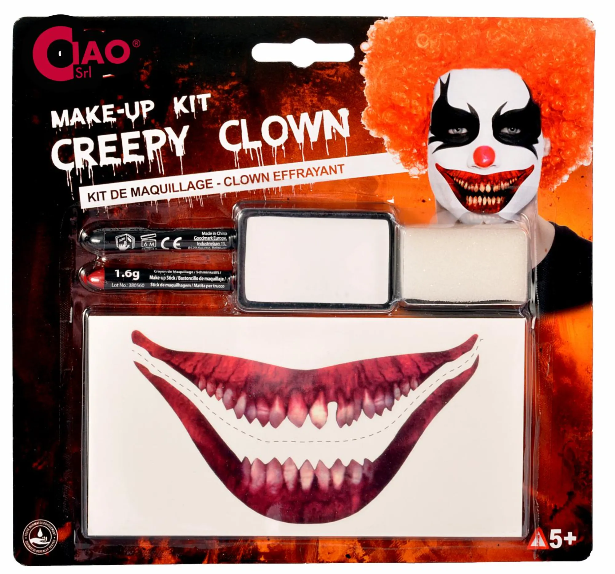 Kit Maquillage Clown Spaventoso comprensivo di: matita rossa, matita nera, trucco bianco, spugnetta e bocca