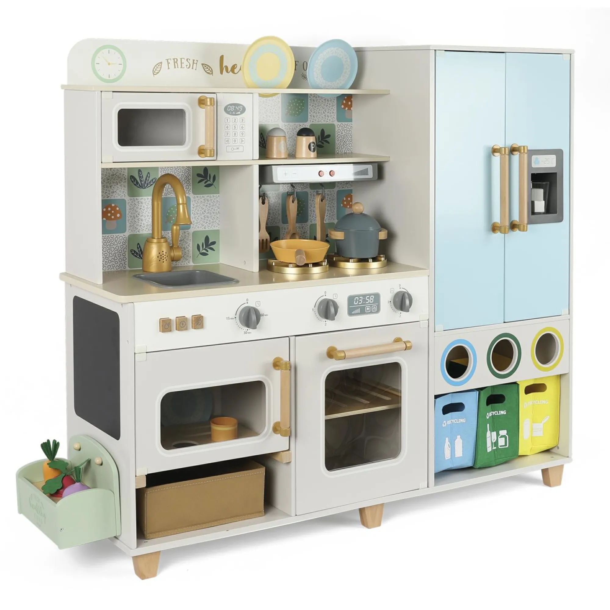 Questa cucina in legno aiuta i bambini a sviluppare l’immaginazione, la socializzazione e il linguaggio. Mentre giocano, i bambini imparano a collaborare, a risolvere problemi e a prendersi cura dell’ambiente attraverso il riciclo.