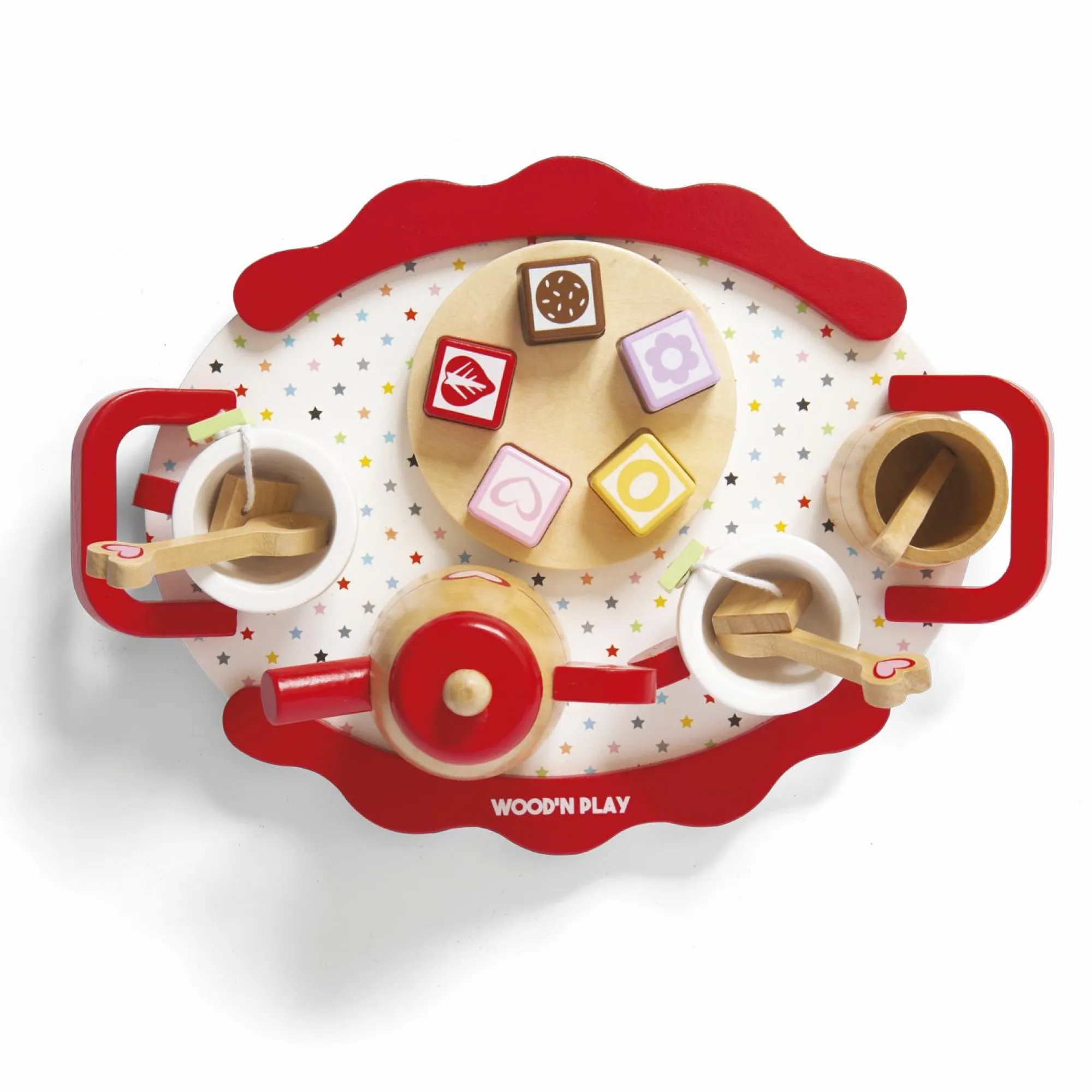 16 pezzi: 1 teiera con coperchio, 1 zuccheriera, 2 tazze, 3 cucchiaini, 1 piattino con 5 pasticcini, 2 bustine di the, 1 vassoio.