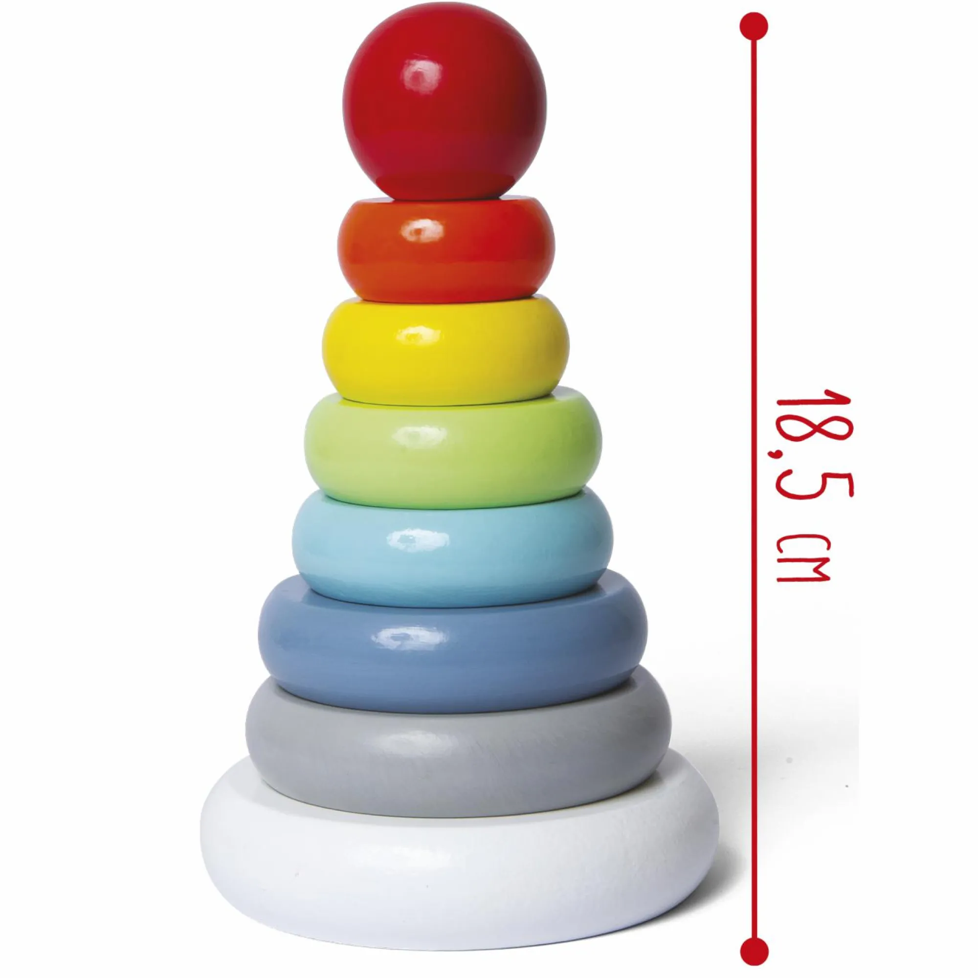 Questa torre colorata come l’arcobaleno, dai colori lucidi e brillanti, insegnerà al bambino a mettere in relazione colori e dimensioni.