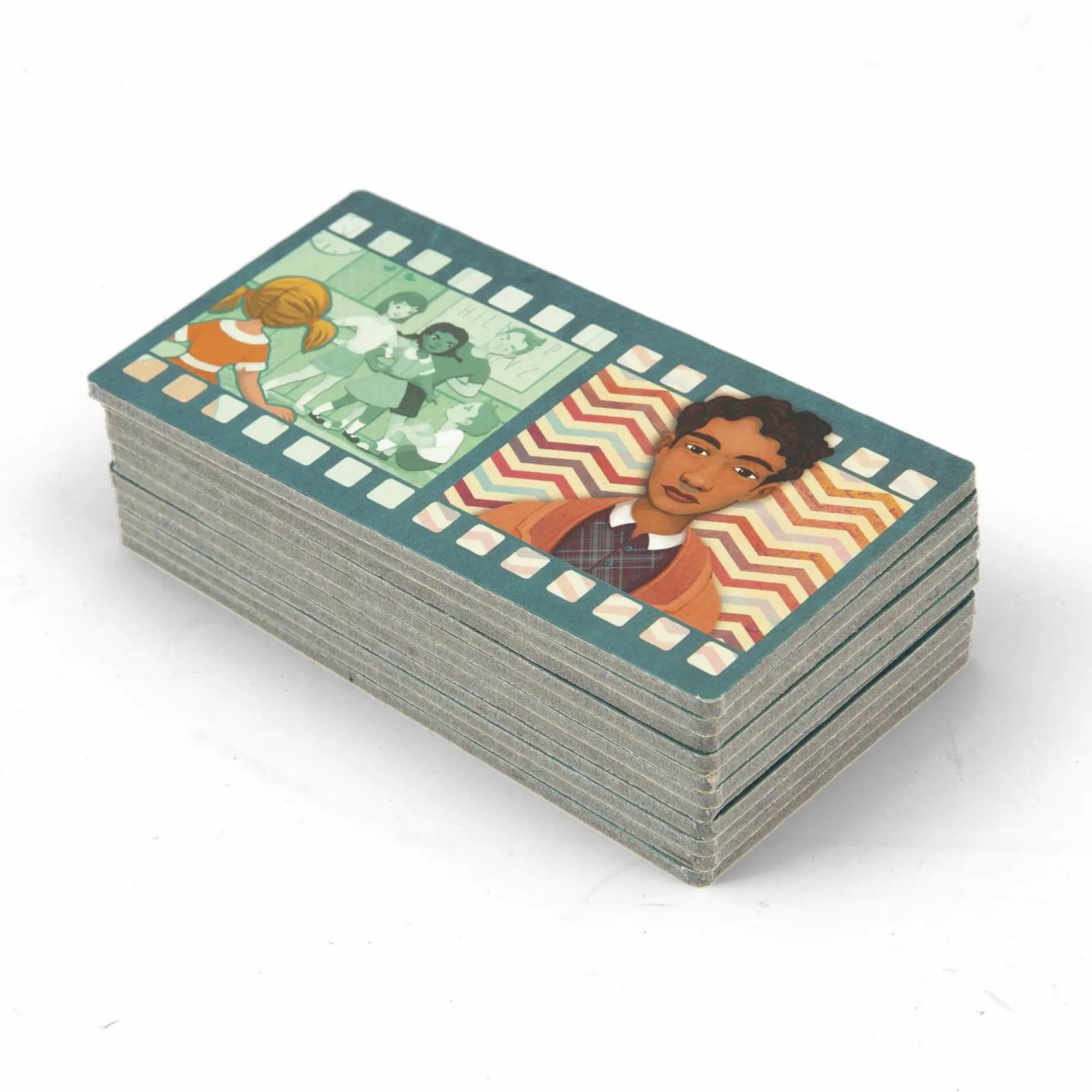 NULLA E’ LASCIATO AL CASO: Illustrazioni dettagliate raffiguranti volti e situazioni inserite in una cornice cinematografica. Ogni personaggio, oltre ad esprimere un’emozione, ha caratteri diversi: età, genere, etnia. Nelle situazioni invece l’emozione da individuare appartiene al soggetto raffigurato a colori per facilitare la comprensione della scena. Dimensione tessera: 10,5 x 5,5 cm