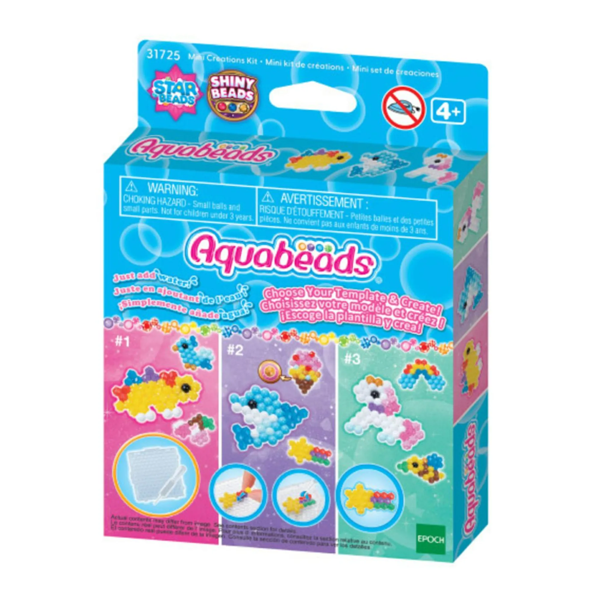 Il Mini Creations Kit è un set perfetto per provare Aquabeads per la prima volta. Seguendo il foglio del modello, si posizionano le perline sul vassoio per creare il proprio disegno. Ci sono tre serie di modelli tra cui scegliere: #1: Stegosauro/uccello/ciliegia, #2: Delfino/gelato/stella cadente, #3: Unicorno/arcobaleno/ape. Scegliete il vostro modello e create! Create i disegni degli altri due set di sagome con le ricariche Aquabeads vendute separatamente.