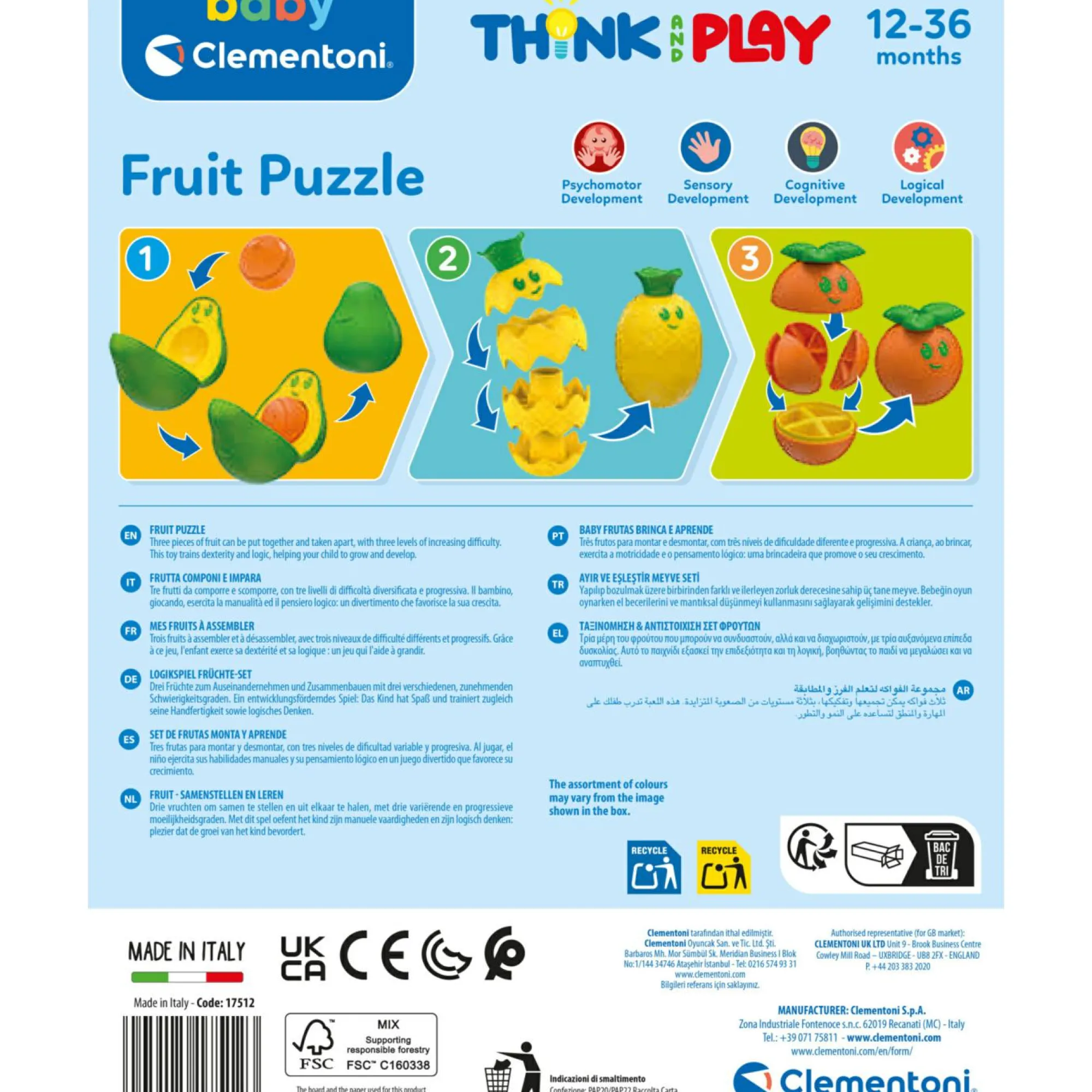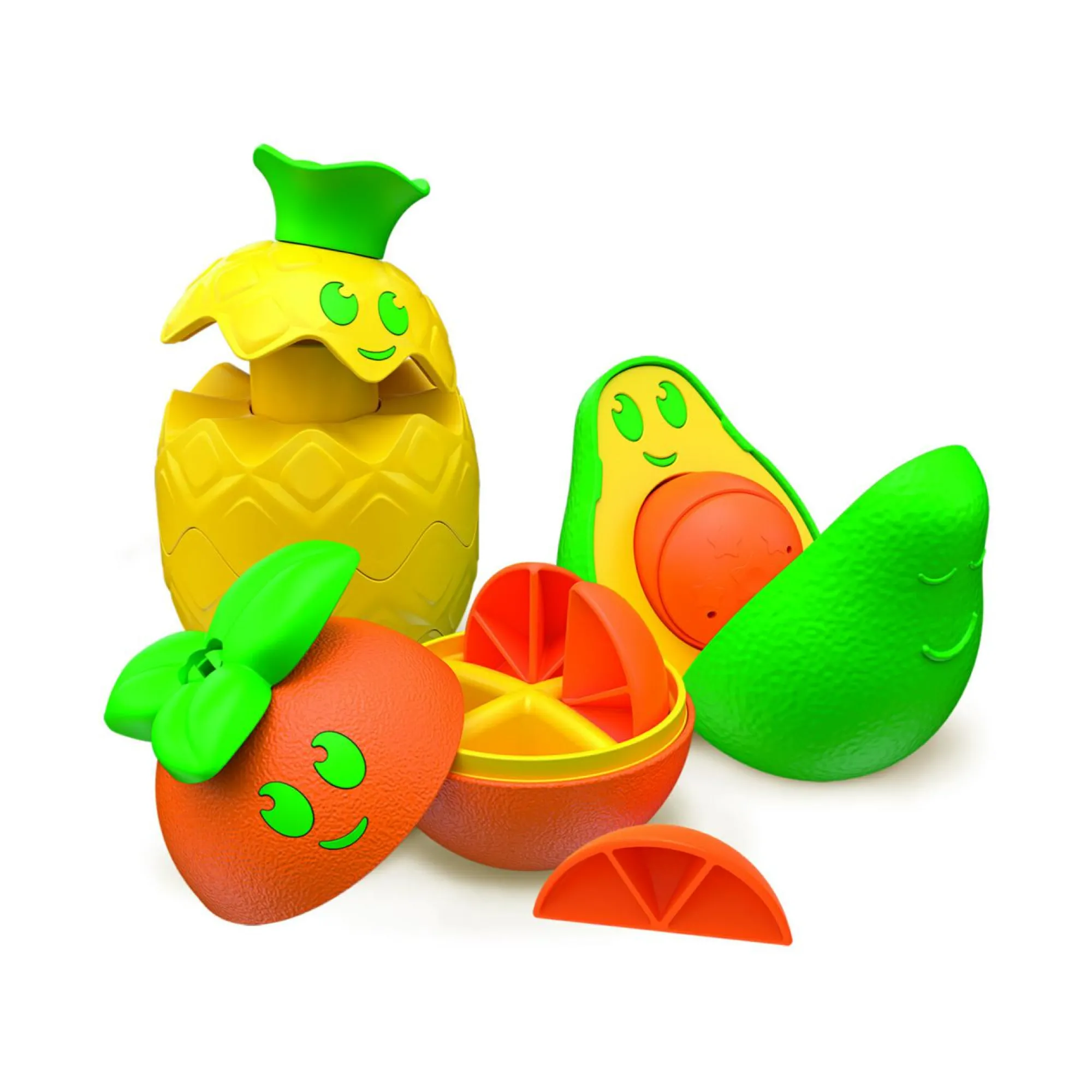 Frutti da ricomporre con giochi a difficoltà crescente per stimolare la logica. Avocado con pallina, ananas impilabile, arancia con 4 spicchi estraibili.