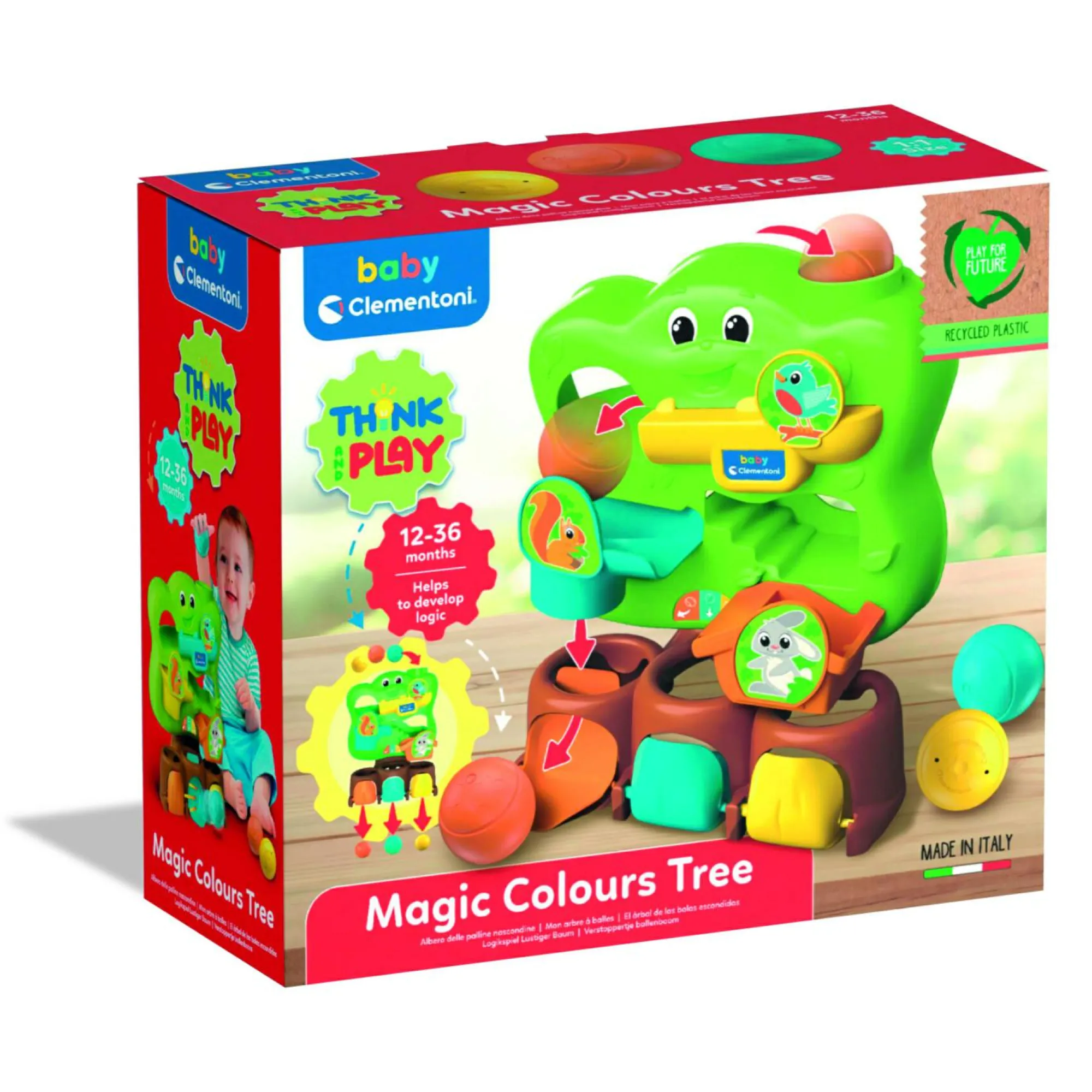 Le tre palline di diverse dimensioni entrano nel tronco e, come per magia, appaiono dietro la porticina dello stesso colore. Allena manualità e logica!