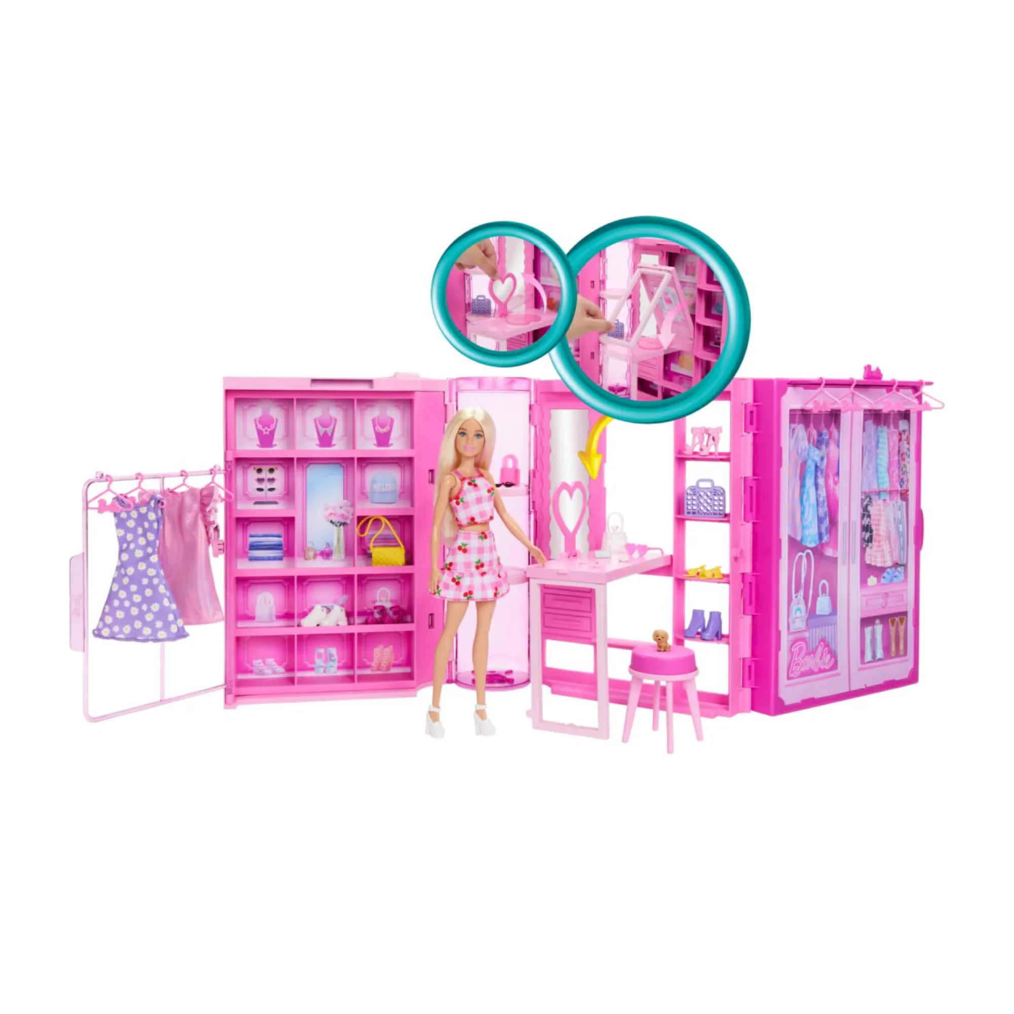 Il guardaroba rosa glitterato si apre su un playset da 91 cm con una bambola Barbie, 25+ pezzi, 20+ scomparti, 2 appendiabiti, una parete per scarpe.