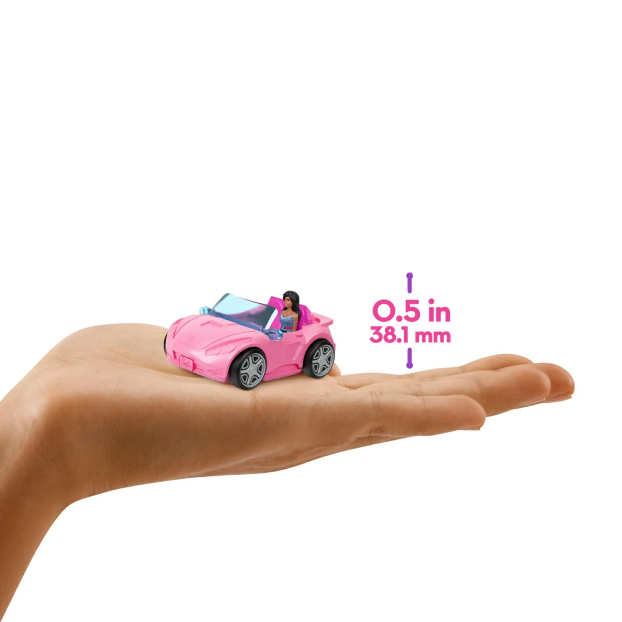 Questo playset include una riproduzione dell’iconica decappottabile di Barbie con una bambola da 3,8 cm e un sorprendente effetto cambia colore!