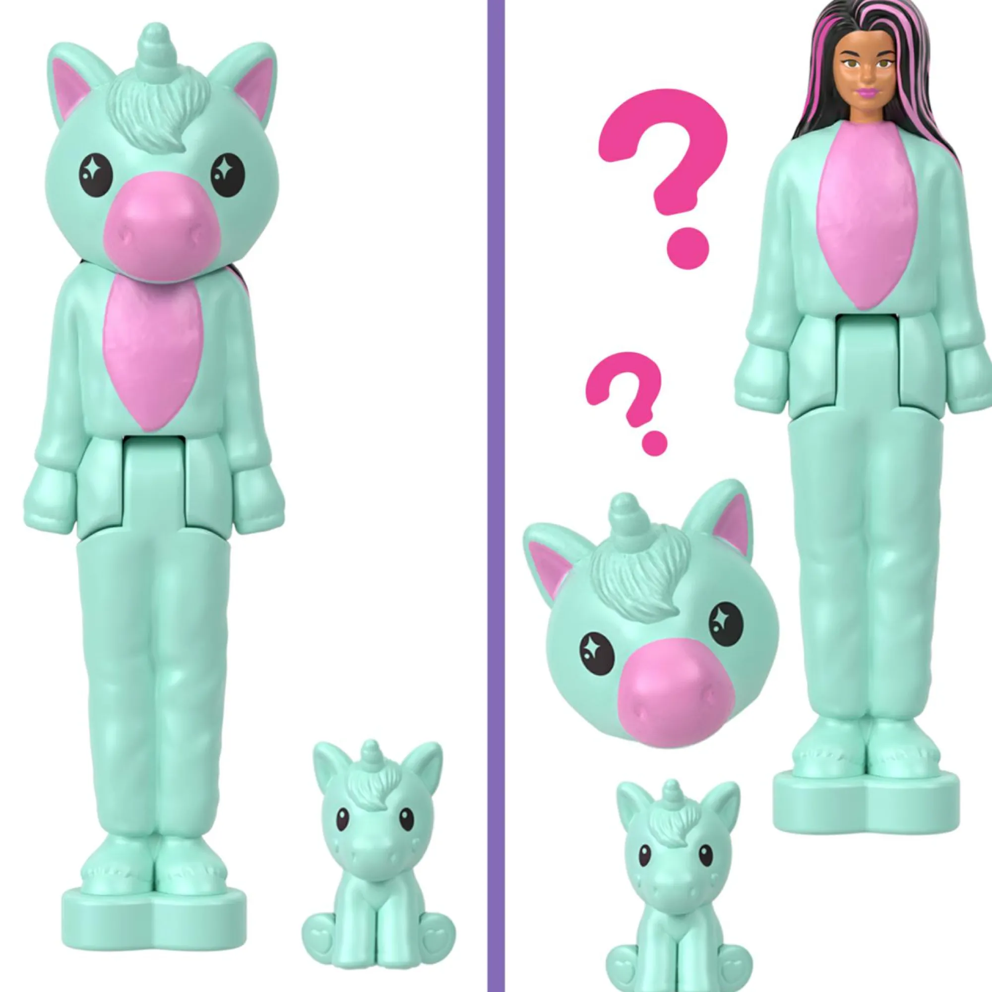 Per un divertimento senza fine, apri il tubo e rimuovi una bambola Barbie da 3,8 cm con un adorabile costume di animale in peluche e un mini cucciolo!