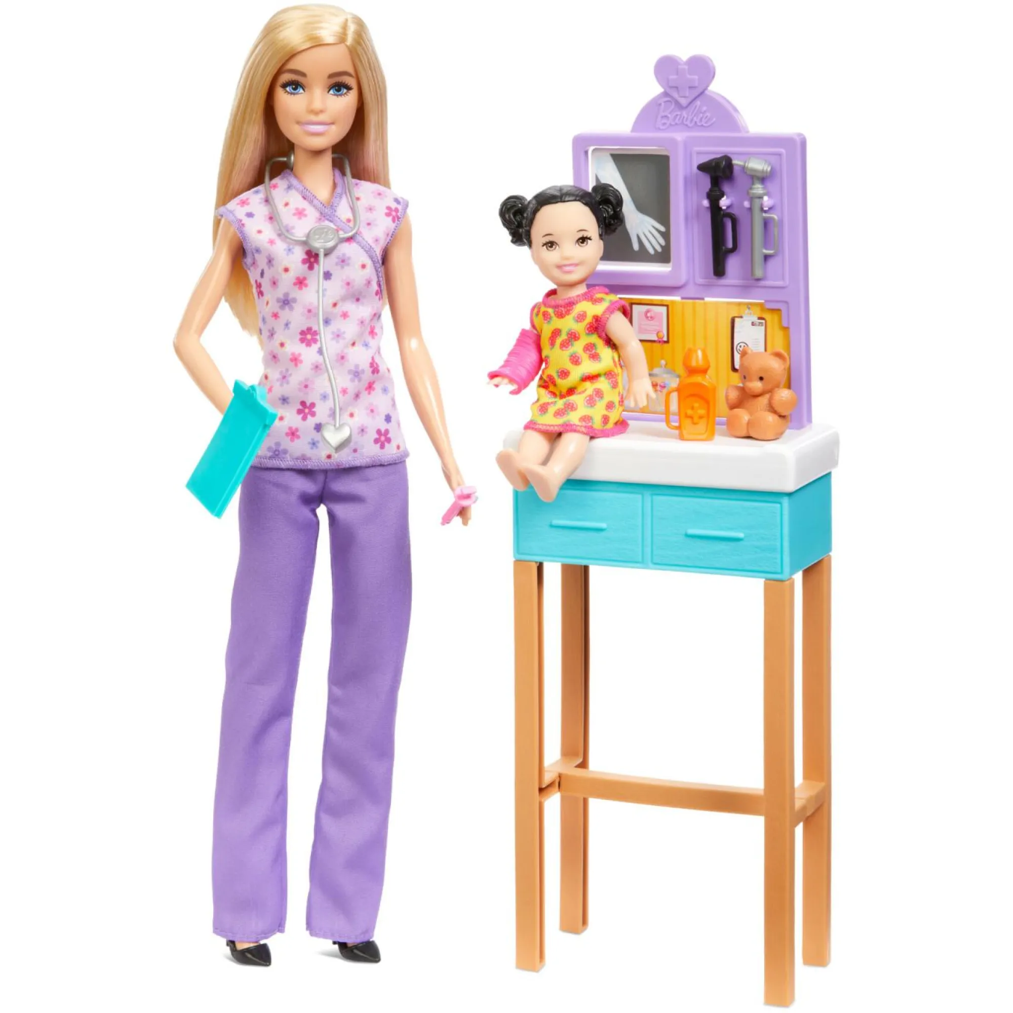 I bambini possono aiutare la dottoressa Barbie® a prendersi cura della piccola con accessori per il gioco di ruolo realistico come il gesso rosa, l’orsacchiotto, lo stetoscopio, la cartellina e altri strumenti medici.