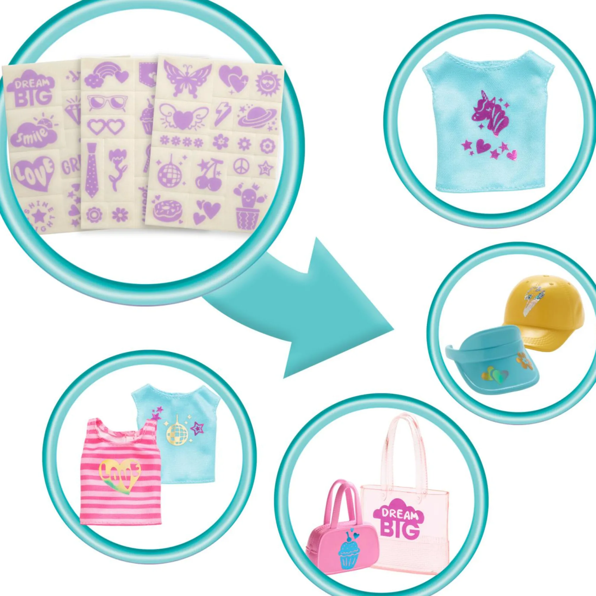 Rimuovi l’adesivo per riutilizzarlo un’altra volta: il set comprende 2 top, 2 cappelli e 3 borse, più 3 fogli di adesivi con immagini iconiche e 5 fogli di alluminio, tra cui 2 con brillantini!